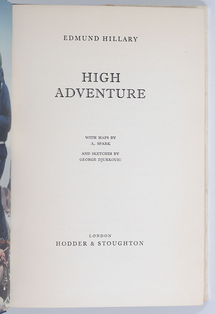 "I will come again and conquer you because as a mountain you can't grow, but as a human, I can": First Edition of High Adventure; Signed by Edmund Hillary