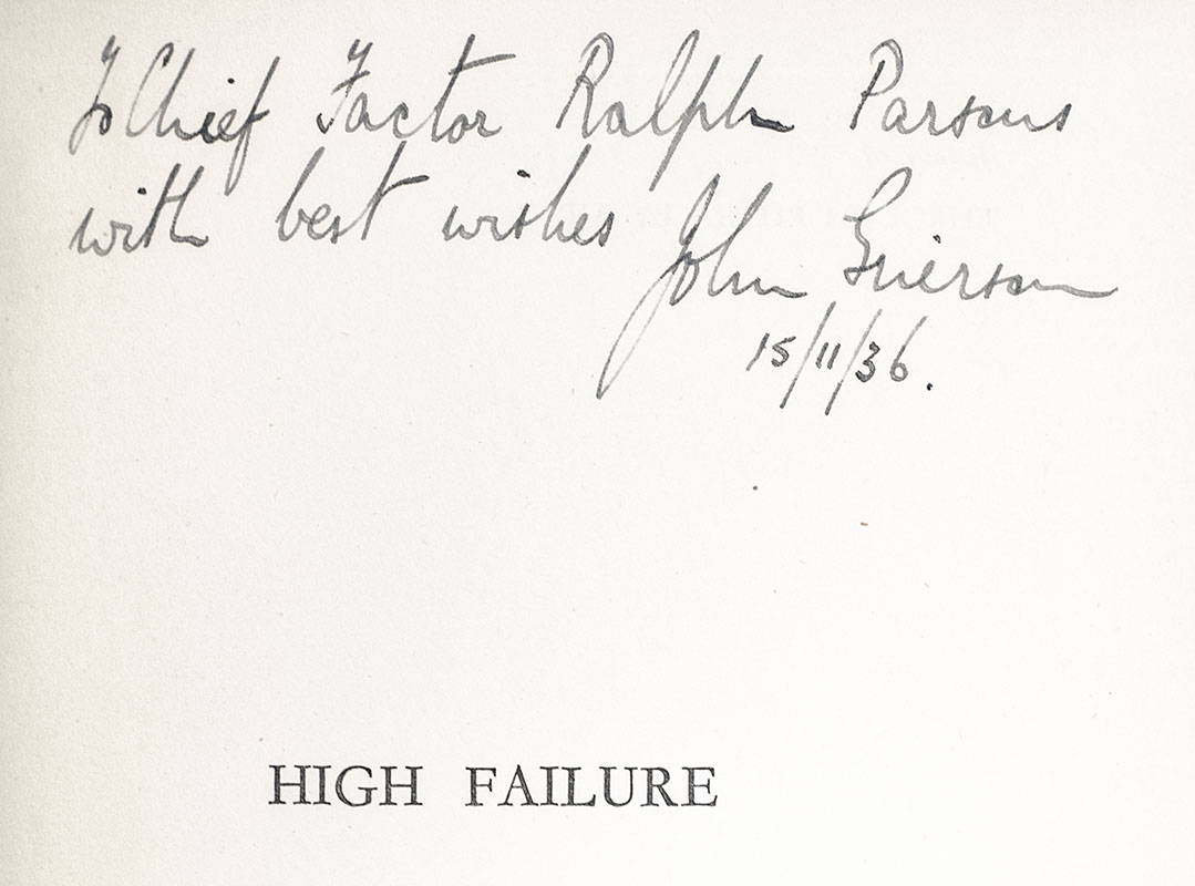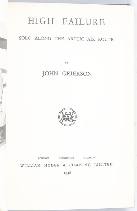 First Edition of John Grierson's High Failure: Solo Along the Arctic Air Route; inscribed by him