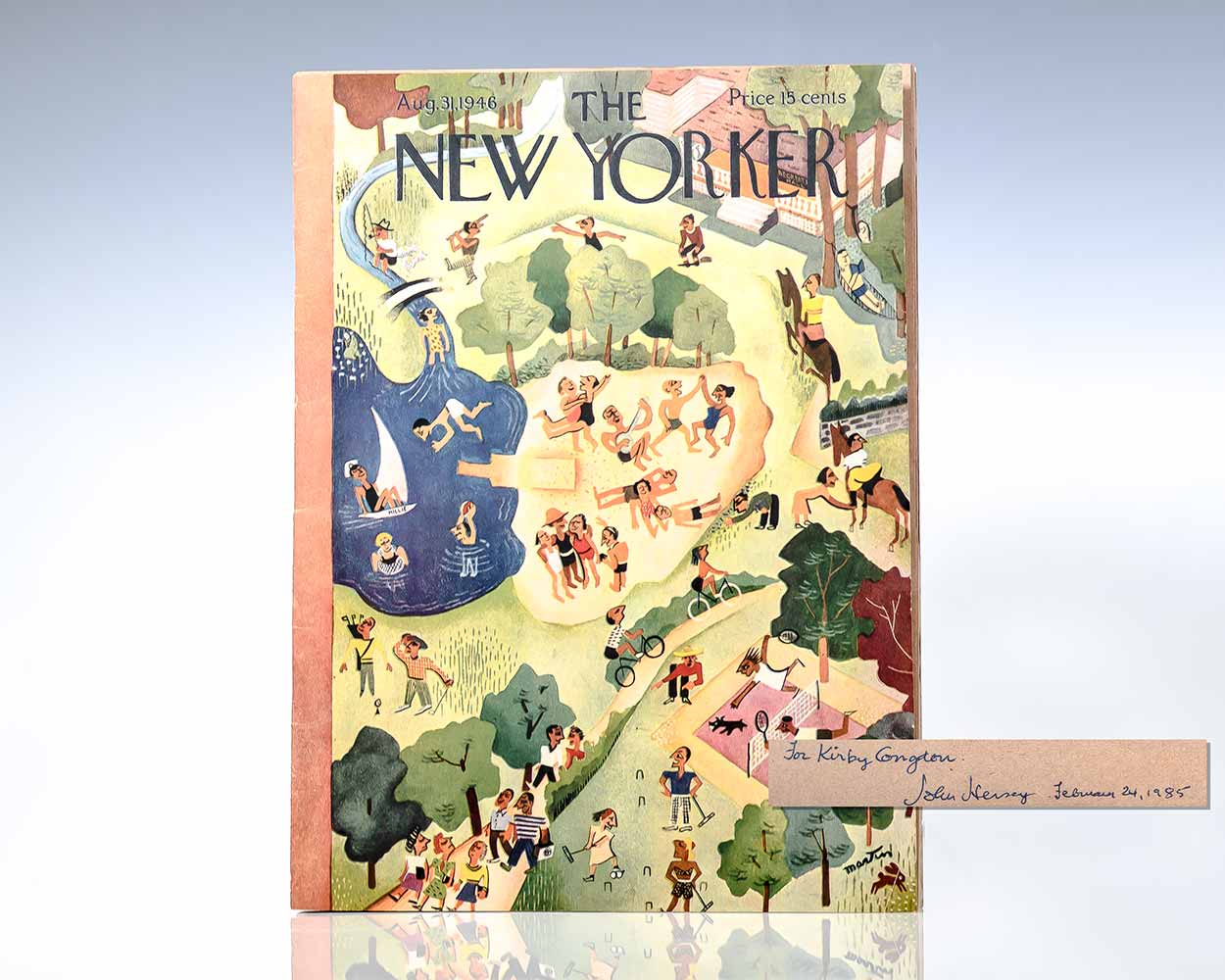 The original August 31, 1946 issue of The New Yorker of Hersey's classic work and is the work's first appearance. The entire issue of the magazine is dedicated to Hersey's piece, and this example is a presentation copy, inscribed on the final page to poet and publisher Kirby Congdon, "For Kirby Congdon - John Hersey, February 24, 1985." Hersey's account of the aftermath of the atomic bomb dropped on Hiroshima, Japan, was judged the finest piece of American journalism of the 20th century by a 36-member panel associated with New York University's journalism department. In very good condition. Rare and desirable signed.