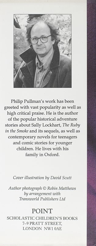 A former schoolteacher and an accomplished playwright, Philip Pullman followed several historical and realistic novels with this literate, sophisticated series, "perhaps the most highly acclaimed work of fantasy for young adults published in the 1990s—in part, certainly, because it can easily be enjoyed by older readers as well. The alternative 20th-century world Pullman creates is extremely imaginative, including creatures as diverse as water gypsies, witches and armored bears… The Dark Materials series is filled with moral ambiguity rather than clear-cut didacticism, and readers as well as [protagonist] Lyra must grapple with the difficult questions raised by the story" (Fantasy and Horror 7-311). "Initially… [Pullman] simply planned to infuse his story with Miltonian atmosphere—'the grandeur, the nobility, the overwhelming magnitude of ambition and imaginative power.' Soon, however, Milton's theme, the Fall of Man, crept into the novel… [Pullman explains,] 'My story resolved itself into an account of the necessity of growing up, and a refusal to lament the loss of innocence" (The New Yorker). Northern Lights earned a 1996 Carnegie Award, "the most prestigious United Kingdom award for children's literature" (Clute & Grant, 791).