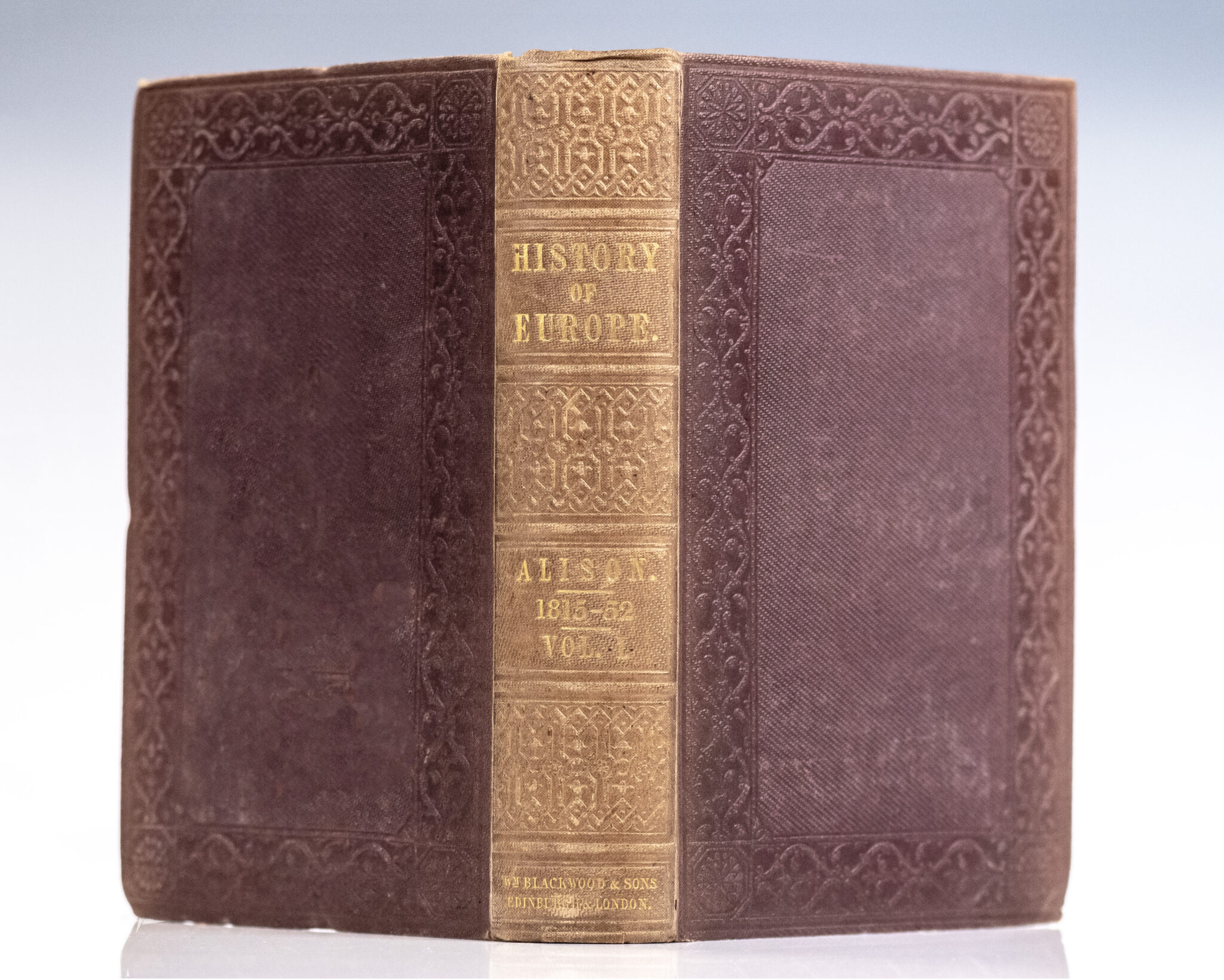 Early edition of this influential work chronicling European events from the French Revolution to the mid-19th century. Octavo, original cloth with gilt titles to the spine, floral border details stamped in blind. From the library of President Millard Fillmore with his ownership signature to the pastedown of the front panel and dated by him, "Millard Fillmore Nov. 21. 1854." In very good condition with sunning to the spine and splitting to the hinges. Ownership stamp to the front free endpaper. Housed in a custom folding chemise and half morocco slipcase. Sir Archibald Alison was a Scottish historian, writer, and advocate whose most notable contributions were in the realm of historical and philosophical writing.