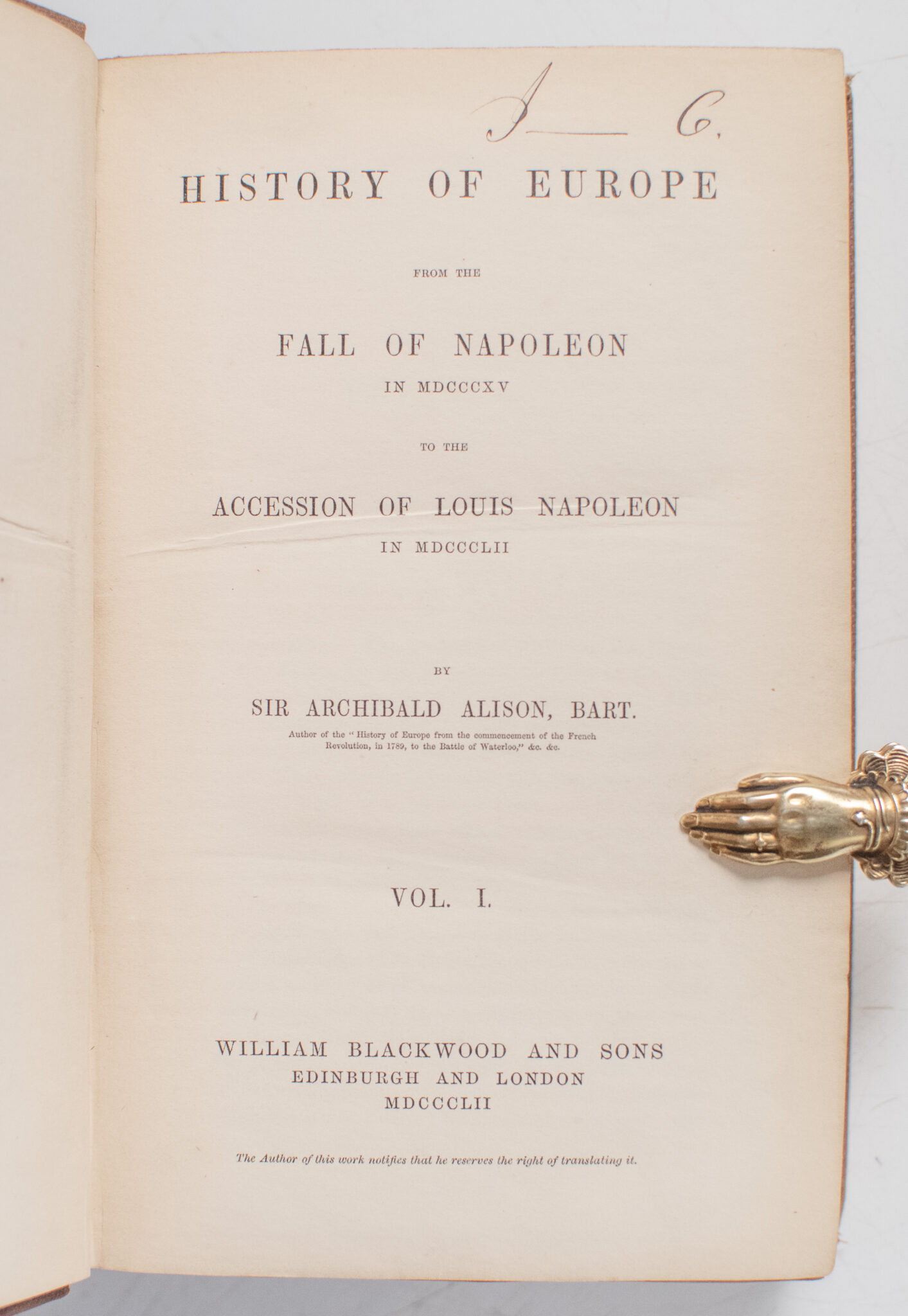 Sir Archibald Alison's History of Europe; From the Library of President Millard Fillmore and Signed by Him
