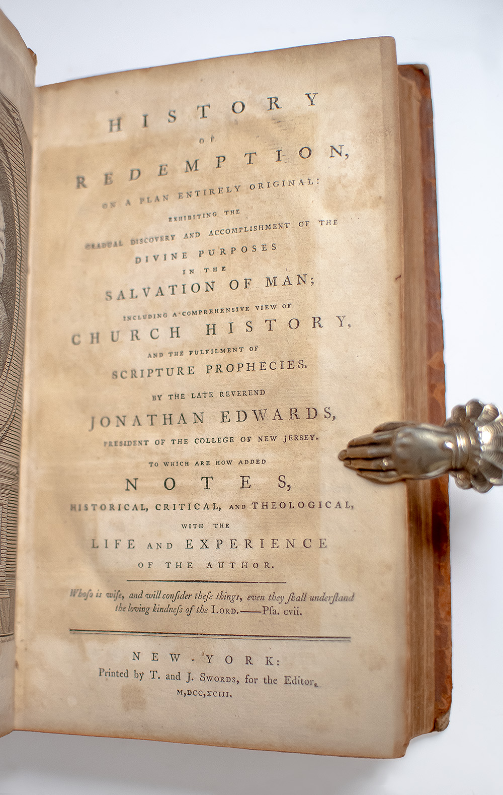 Early edition of this work by the famed philosopher and theologian. Title reads in full: History of Redemption, on a Plan Entirely Original: Exhibiting the Gradual Discovery and Accomplishments of the Divine Purposes in the Salvation of Man; Including a Comprehensive View of Church History, and the Fulfilment of Scripture Prophecies. Octavo, bound in full contemporary calf, frontispiece. In good condition with rubbing and wear to the extremities, toning, and losses to the hinges. Ownership signature to the front free endpaper.
