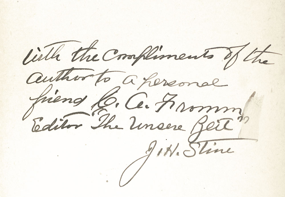 Second edition of Stine's history of the the principal Union Army in the Eastern Theater of the American Civil War. Octavo, original cloth, patterned endpapers, illustrated. Presentation copy, inscribed by the author on the flyleaf, "With the compliments of the author to a personal friend C.A. Fromm... J.H. Stine." In very good condition. Rare.