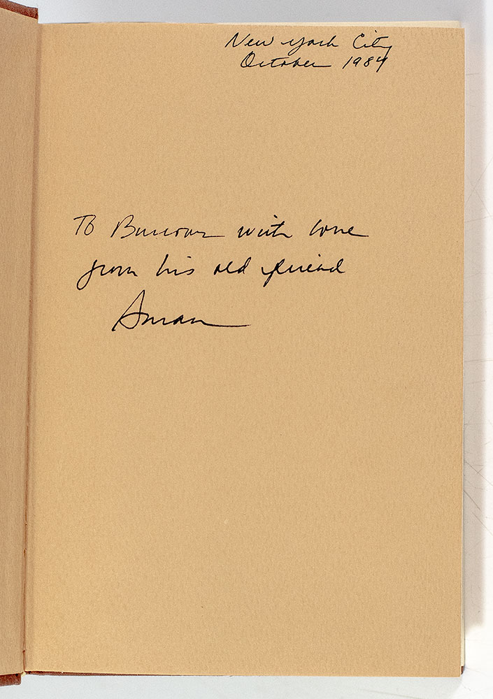First edition of Cheever's candid portrait of her father, John Cheever. Octavo, original cloth. Presentation copy, inscribed by the author on the front free endpaper, "New York City October 1984 To Burrows with love from his old friend Susan." The recipient, American litigator Kenneth David Burrows married American novelist Erica Jong in 1989. Jong remains best known for her 1973 novel Fear of Flying which became famously controversial for its portrayal of female sexuality and figured prominently in the development of second-wave feminism. Written in the first person and narrated by its protagonist, 29-year-old American poet Isadora Wing, Fear of Flying was written in the throes of the Sexual Revolution of the 1970s and encapsulated the movement’s redefinition of female sexuality. In interviews, Jong stated: “At the time I wrote Fear of Flying, there was not a book that said women are romantic, women are intellectual, women are sexual—and brought all those things together… What [Isadora is] looking for is how to be a whole human being, a body and a mind, and that is what women were newly aware they needed in 1973.” The novel remains a feminist classic and has sold more than 20 million copies worldwide. From the library of Erica Jong and Ken Burrows. Fine in a near fine dust jacket. Jacket design by Bernadette Evangelist.