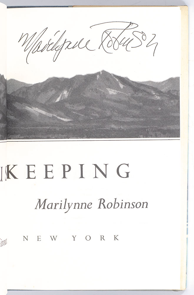 First edition of the Pulitzer Prize-winning author's memorable first novel. Octavo, original half cloth. Boldly signed by Marilynne Robinson on the title page. Near fine in a near fine dust jacket. Jacket art by Robert Sabin. Designed by Cynthia Krupat. Laid in is the original program where this book was signed by Robinson. An exceptional example.