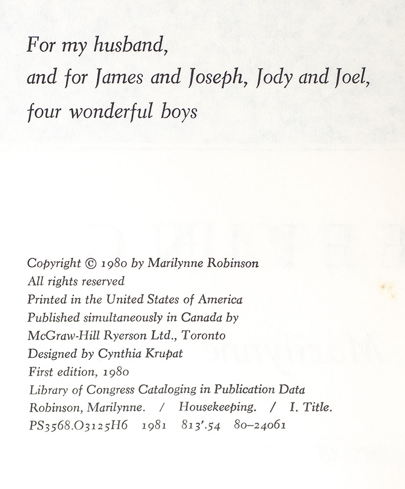 "I believe it was crossing the bridge that changed me finally": First Edition Of The Authors First Book Housekeeping; Signed By Marilynne Robinson