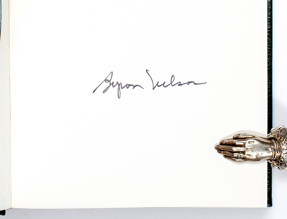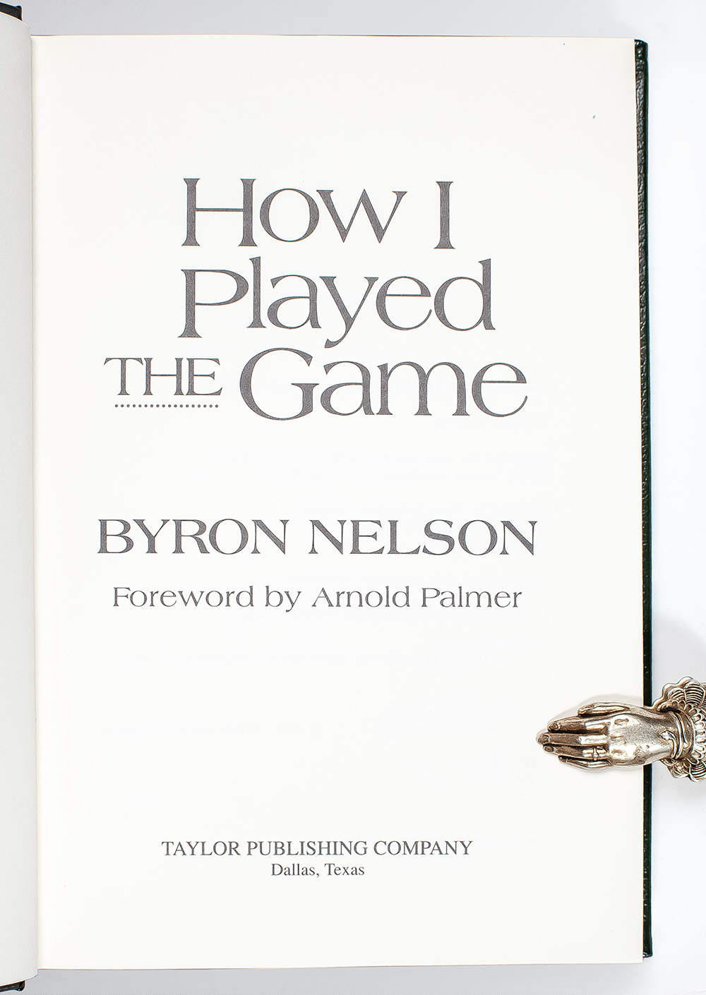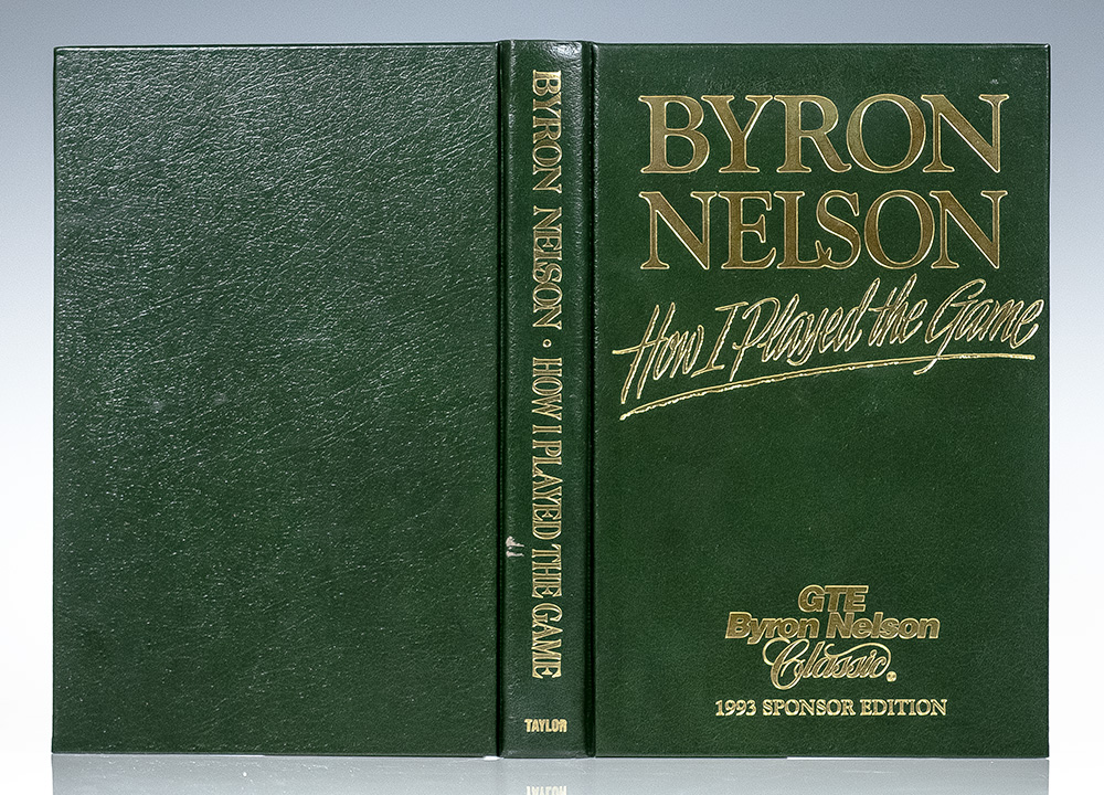 First special 1993 Sponsor edition of Nelson’s classic autobiography. Octavo, original publisher's full forest green leatherette with gilt titles to the spine and front panel, illustrated with frontispiece and photographic plates. One of one thousand one hundred copies signed by Byron Nelson on the semi-transparent flyleaf, this is number 58. In near fine condition, bookplate to the front pastedown. Accompanied by the original gilt engraved GTE Byron Nelson Classic metal clip bookmark.