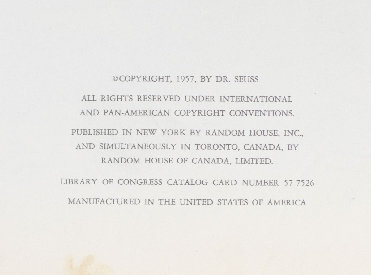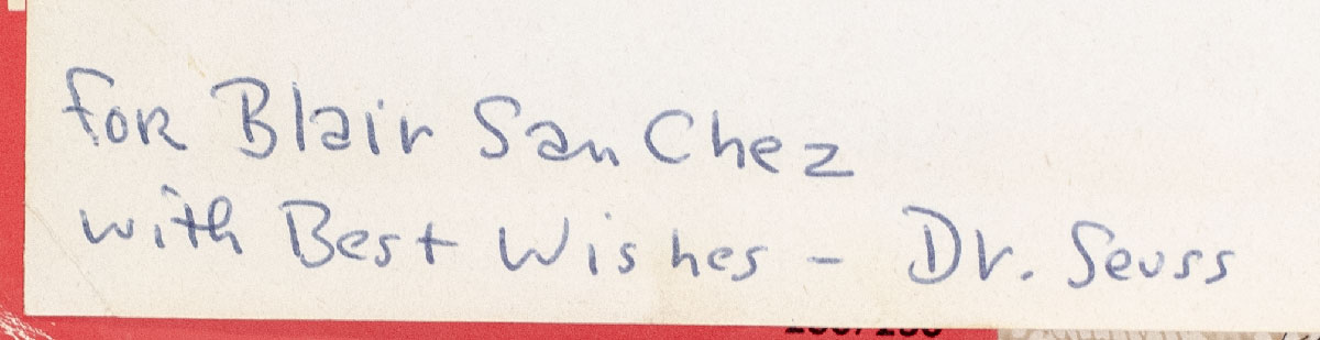 First edition, first printing of one of the most celebrated and memorable Christmas stories with all issue points present: Cat in the Hat on back cover of book with 14 titles (up to now) listed on the rear flap and a list of 13 books printed at the end of the book. Dust jacket price reads 250/250. Thin quarto, original illustrated glossy paper boards, pictorial endpapers. Presentation copy, inscribed by the author opposite the half-title page, "For Blair Sanchez with Best Wishes- Dr. Seuss." The recipient, Blair Sanchez was a neighbor and friend of Dr. Seuss. Near fine in a very good dust jacket.