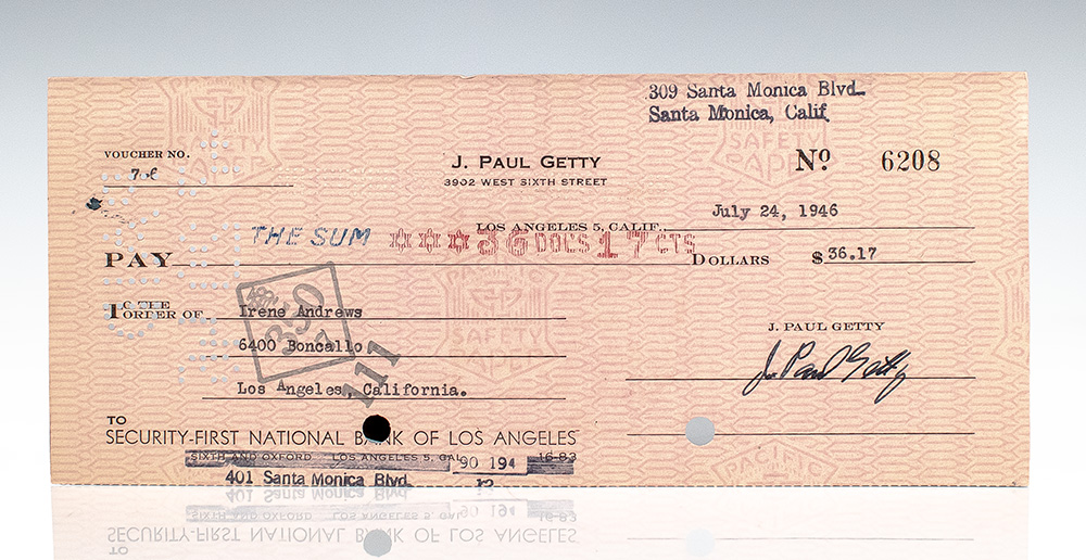 First edition. Octavo, original cloth. Additionally with a signed personal check, stamped and typed on Pacific Safety paper, made payable to the Irene Andres. for $36.17 on July 24, 1946. “Paid” hole-punching to the edge, signed “J. Paul Getty.” Near fine in a very good dust jacket.
