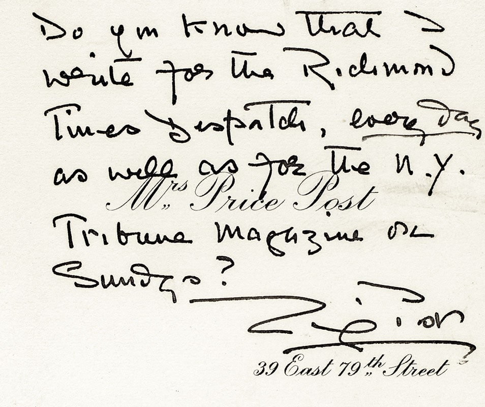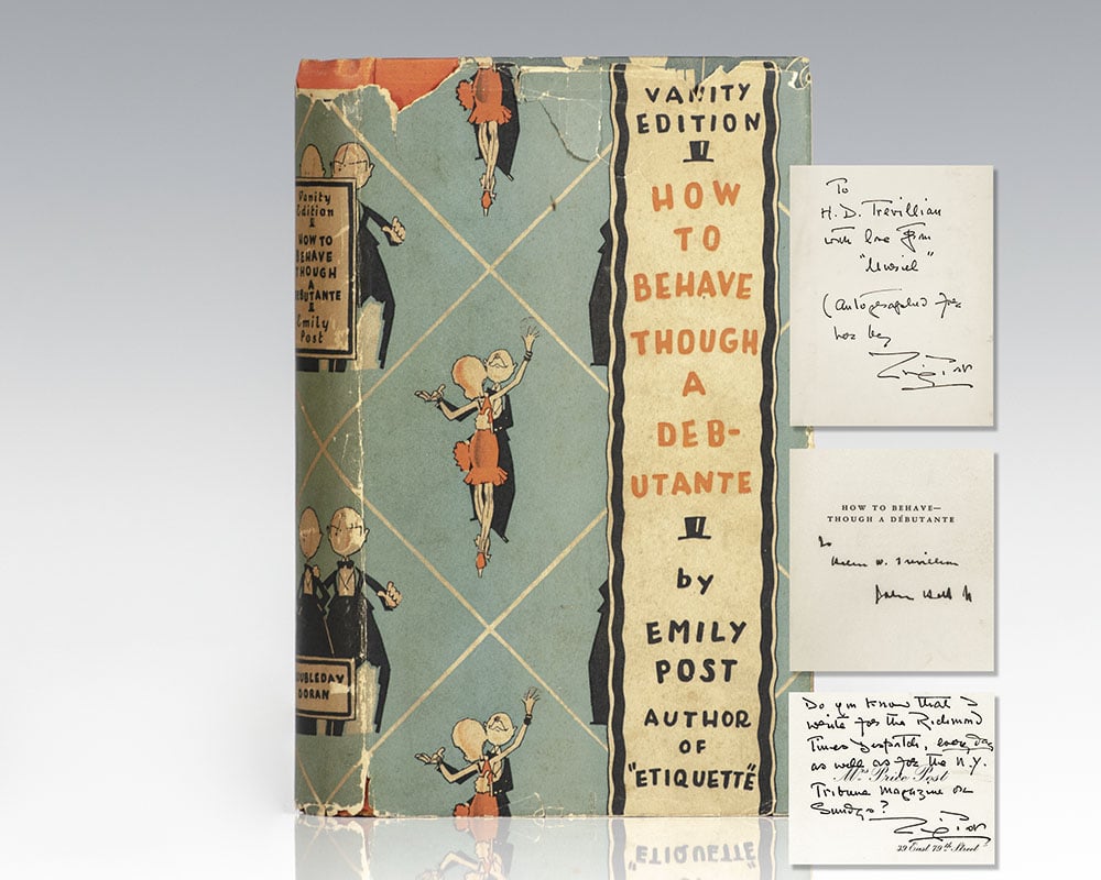 Scarce first edition of one of Post's several humorous sequels to Etiquette, with illustrations by John Held Jr., one of the best-known magazine illustrators of the 1920s. Octavo, original half cloth over pictorial boards, paper spine label, top edge red, illustrations by John Held Jr. Presentation copy, inscribed by Emily Post on the front free endpaper, "To H.D. Trevillian with love from 'Muriel' autographed for her by Emily Post" and with a note on her calling card affixed to the rear pastedown, "Do you know that I write for the Richmond Times Dispatch, every day as well as for the N.Y. Tribune Magazine on Sundays? Emily Post." Additionally inscribed by John Held Jr. on the half-title page, "To Helen W. Trevillian John Held Jr." Very good in the scarce original dust jacket which is in very good condition.