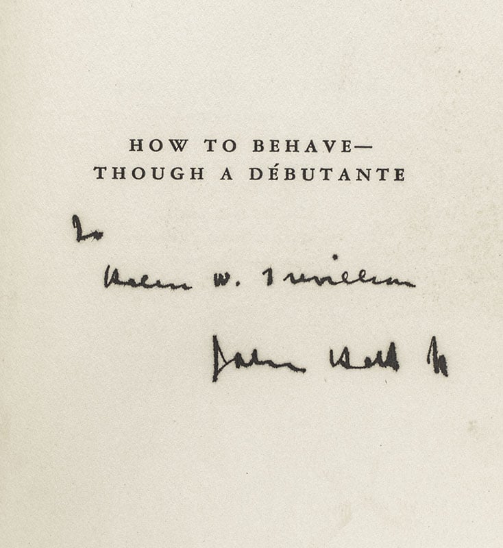 "Just what a smart girl can get away with - and how!": Rare first edition of Emily Post's How To Behave Though A Debutante; inscribed by both Emily Post and Illustrator John Held Jr. and with a Signed note on Post's Calling Card tipped in