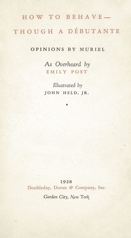 Post wrote in various styles, including humorous travel books, early in her career. She published her first etiquette book Etiquette in Society, in Business, in Politics, and at Home (frequently referenced as Etiquette) in 1922 at the age of 50; it became a best-seller, with equally popular updated versions appearing for the next several decades, including the present volume. How to Behave Though a Debutante features the opinions of the fictitious debutante Muriel, as overhead by Post, including chapters on the average day of a debutante, navigating taboo subjects of conversation, taming wild men, how to train a beau, and how to be a specialist in success. With illustrations by American cartoonist John Held, Jr., one of the best-known magazine illustrators of the 1920s whose satirical drawings depicting the flapper era have continued to define the Jazz Age for subsequent generations.