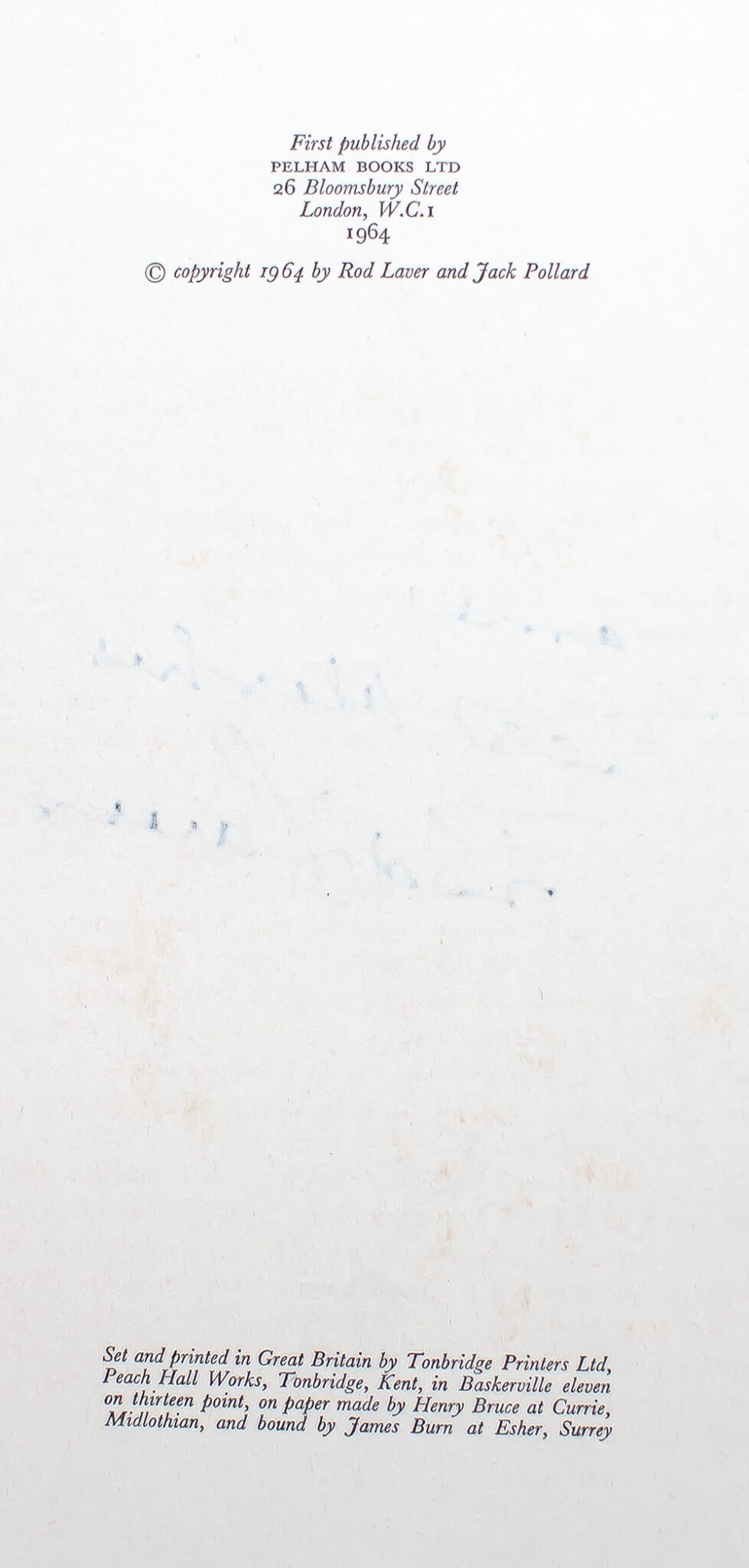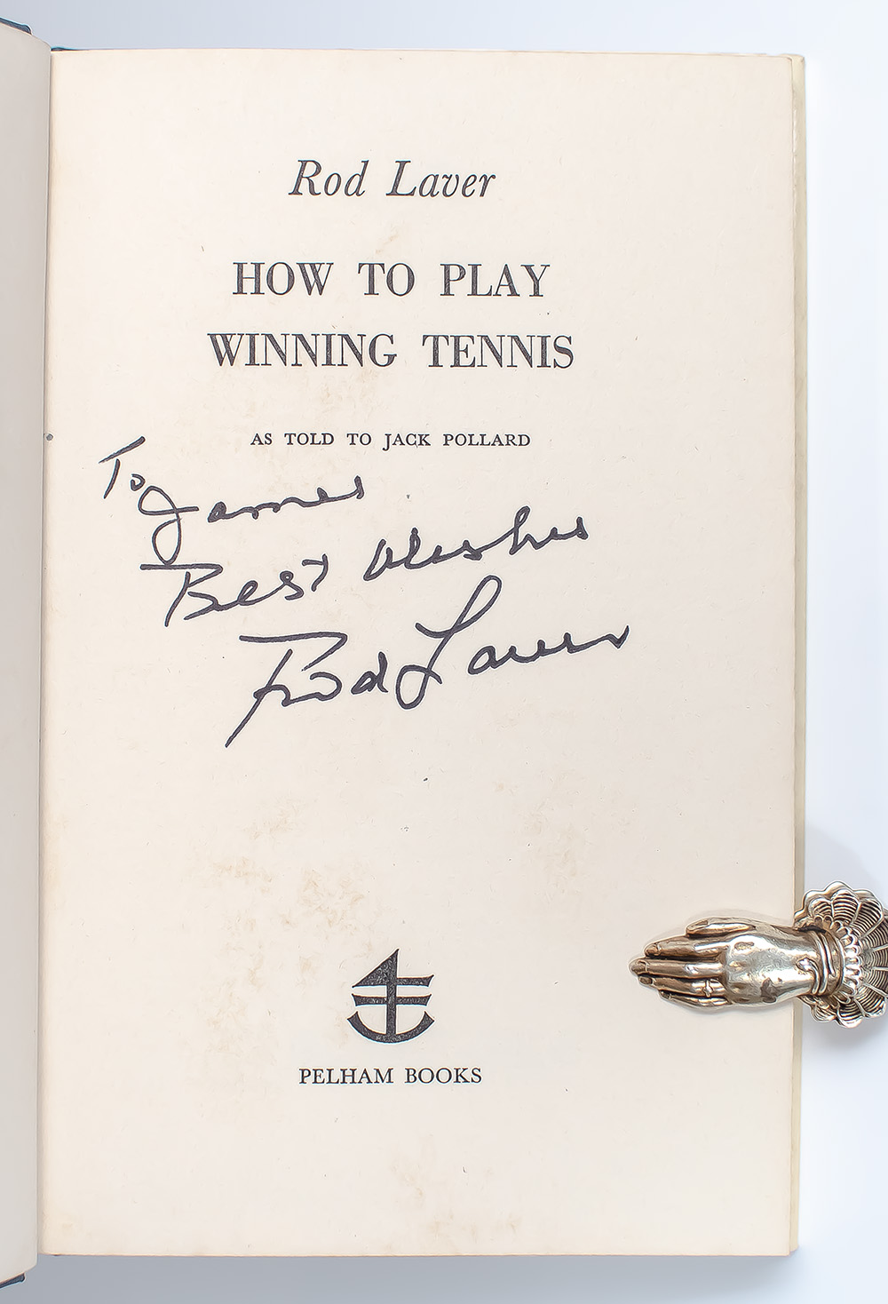 First edition of the tennis legends first book. Octavo, original cloth, illustrated. Inscribed by the author on the title page, "To James Best Wishes Rod Laver." Near fine in a near fine price-clipped dust jacket. Rare and desirable signed and inscribed.