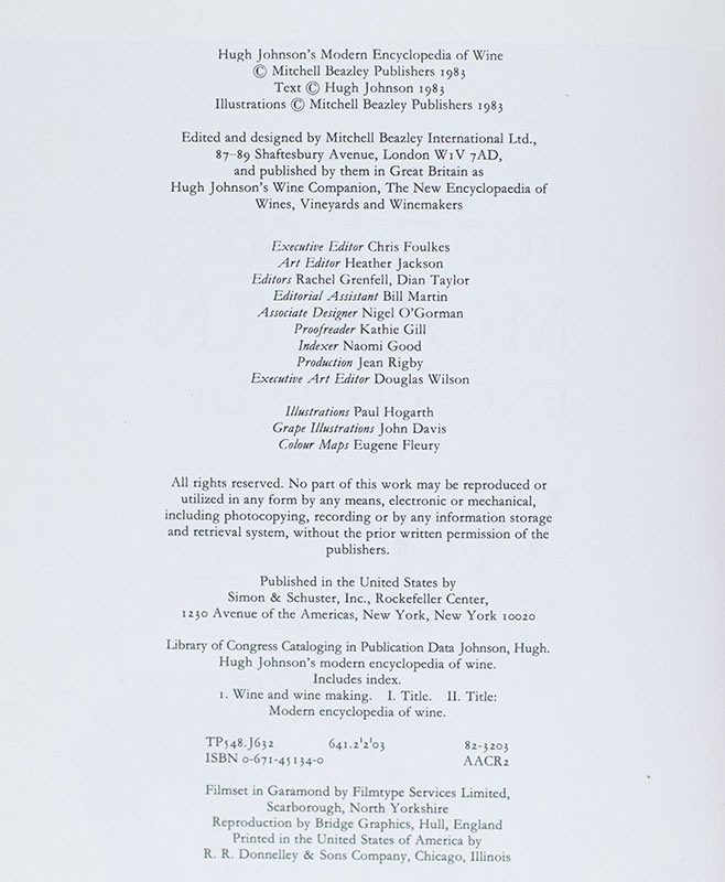 "A BEST-SELLING CLASSIC... THE MOST RELIABLE, COMPREHENSIVE REFERENCE BOOK ON WINE EVER WRITTEN": First Edition of Hugh Johnson's Modern Encyclopedia of Wine; Signed by Him