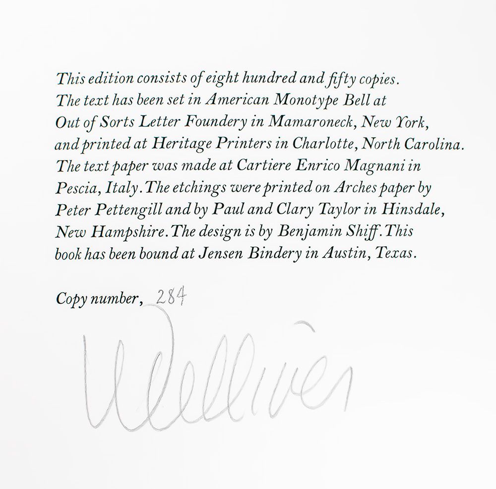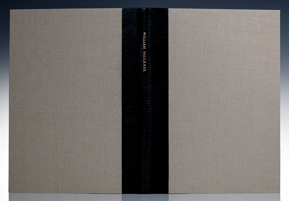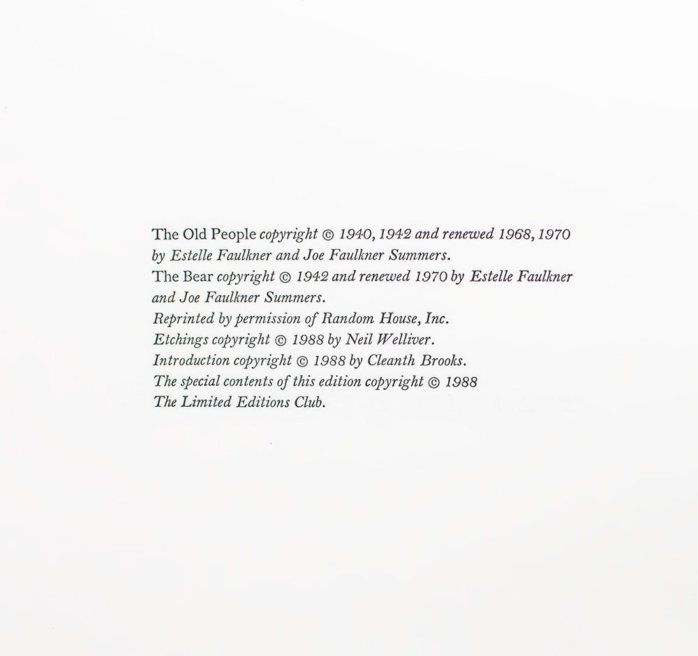 The Limited Editions Club signed limited edition of two of Faulkner’s hunting tales: "The Bear" and "The Old People." Folio, bound in quarter black morocco over linen boards with author's name in gilt on the spine, illustrated with two color etchings. Boldly signed by illustrator Neil Welliver on the colophon page at the rear. One of 850 numbered copies, this is number 284. In fine condition. Introduction by Cleanth Brooks. Illustrated by Neil Welliver. Housed in a custom linen slipcase.
