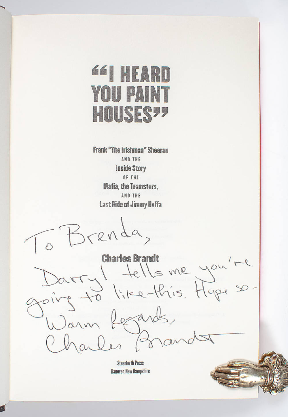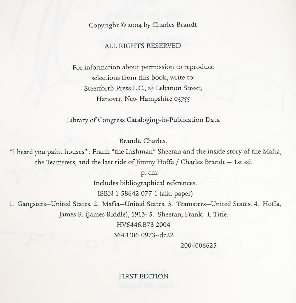 First Edition of I Heard You Paint Houses: Frank "The Irishman" Sheeran & Closing the Case on Jimmy Hoffa; Inscribed by Charles Brandt and Signed by Al Pacino