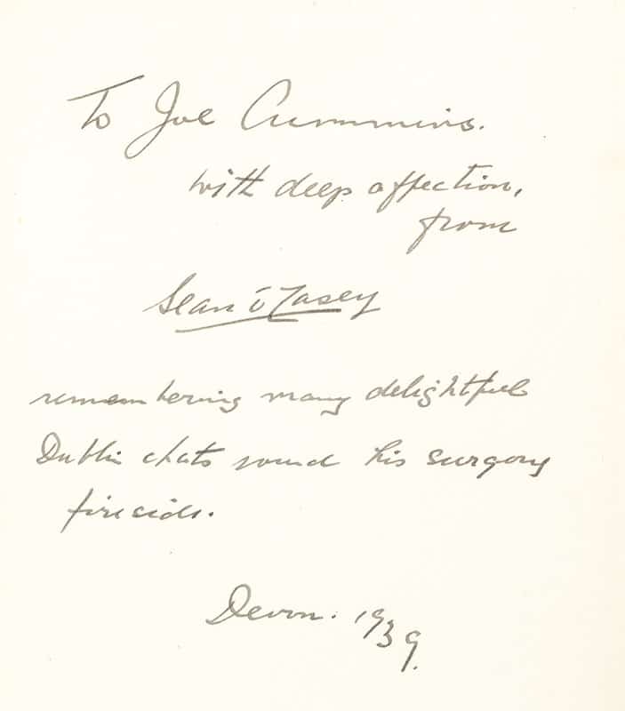 First edition of this autobiography by the famed Irish playwright. Octavo, original cloth, frontispiece. Presentation copy, inscribed by the author in the year of publication, "To Joe Cummins, with deep affection, from Sean O'Casey remembering many delightful Dublin chats round his surgery firesides. Devon 1939. Near fine in a very good price-clipped dust jacket.