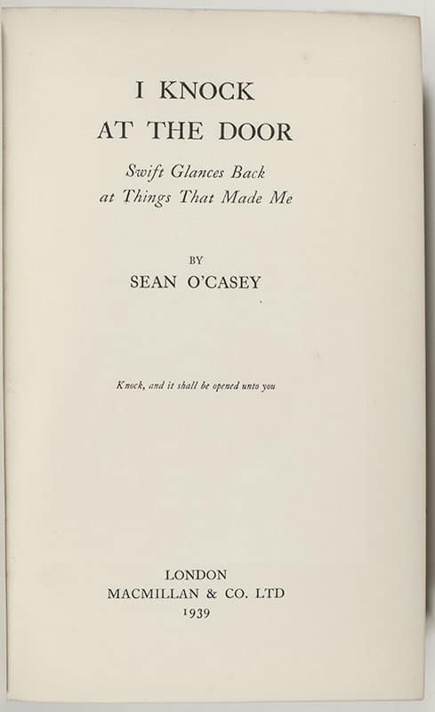 "Knock, and it shall be opened unto you": First Edition of Sean O'Casey's I Knock At The Door; Lengthily Inscribed by Him