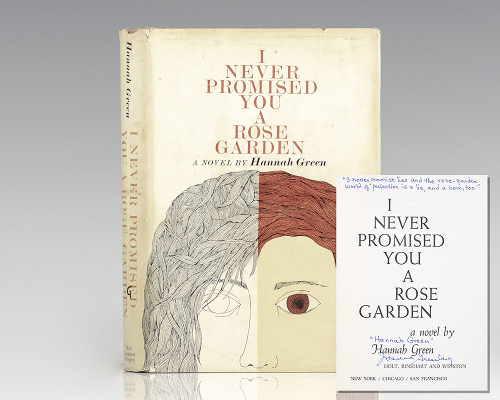 First edition of the author's semi-autobiographical modern classic novel. Octavo, original cloth. Lengthily signed by the author as Joanne Greenberg and her pseudonym "Hannah Green", as follows, "I never promise lies and the rose-garden world of perfection is a lie, and a bore too." "Hannah Green" Joanne Greenberg." Near fine in a very good dust jacket. Jacket design by Ellen Raskin. An exceptional inscription.