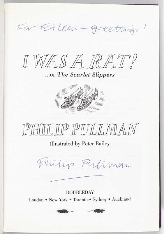 First Edition of Philip Pullman's I Was A Rat! ...or The Scarlet Slippers; inscribed by him