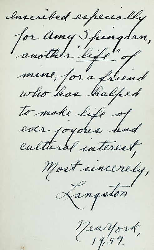 First edition of Hughes' classic autobiography. Octavo, original cloth. Association copy, lengthily inscribed by the author with a full page inscription on the front free endpaper, "Inscribed especially for Amy Spingarn, another "life" of mine, for a friend who has helped to make life of ever joyous and cultural interest. Most sincerely, Langston New York 1957." The recipient, Amy Einstein Spingarn was a philanthropist, poet, and artist known especially for her paintings of prominent African-American cultural figures. Upon the death of her husband, Joel Spingarn, in 1939, Amy Spingarn was elected to finish out his term on the NAACP Board of Directors. Covers show some wear and some spotting in a very good dust jacket. An exceptional association.