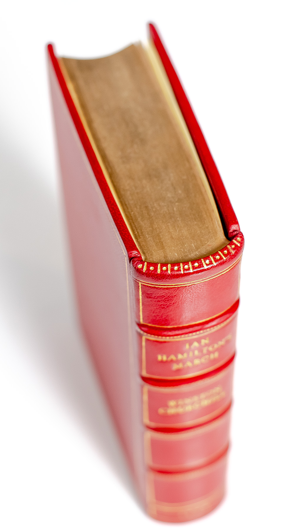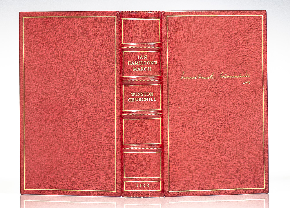 First edition of Churchill's fifth book, a continuation of his coverage of the Boer War which he began in London to Ladysmith via Pretoria. Octavo, bound in full morocco by the Harcourt Bindery, gilt titles and tooling to the spine in six compartments within raised gilt bands, gilt ruling to the front and rear panels, gilt signature to the front panel, gilt inner dentelles stamp-signed by the Harcourt Bindery, marbled endpapers, all edges gilt,engraved frontispiece portrait of Ian Hamilton, folding map in color and 4 pages of advertisements for Churchill's works at rear. In fine condition.