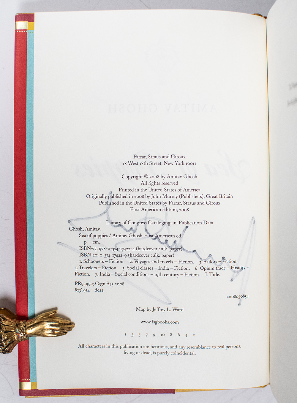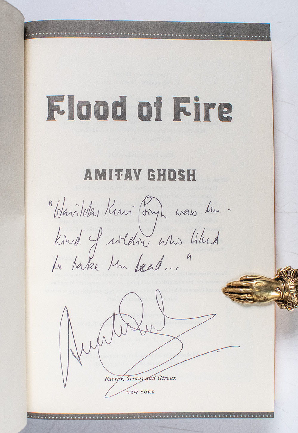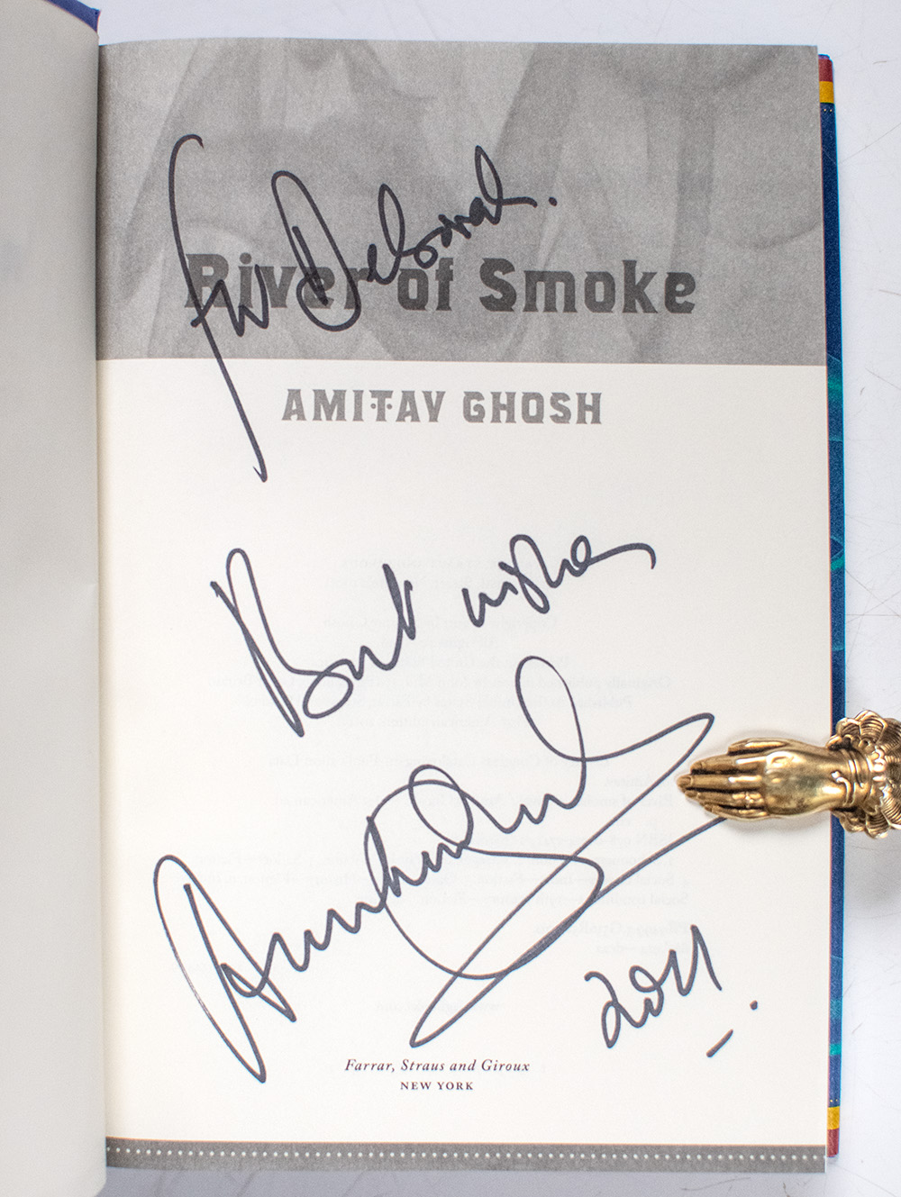 First American editions of this critically acclaimed trilogy. Octavo, original publisher's cloth. Boldly signed by the author on the title page of each volume. River of Smoke is inscribed and dated in the year of publication, "For Deborah Best wishes Amitav Ghosh 2011"; and Flood of Fire is signed and inscribed with a quote from the book. Each volume is fine in a fine dust jacket. Jacket design by Susan Mitchell. Author photographs by Dayanita Singh and Emilio Madrid-Kuser.