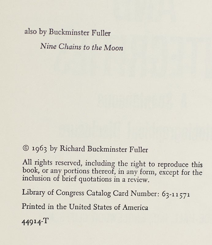 First edition of this work by Fuller. Octavo, original cloth. Association copy, inscribed "To Brooke, with great love, Bucky 3/30/80." The recipient, Brooke Maxwell, along with one of Fuller's other nieces Sarah Abbot, was one of Fuller's key assistants on his Synergetics Project. Edited by Robert W. Marks. Near fine in a very good price-clipped dust jacket. A fine association.