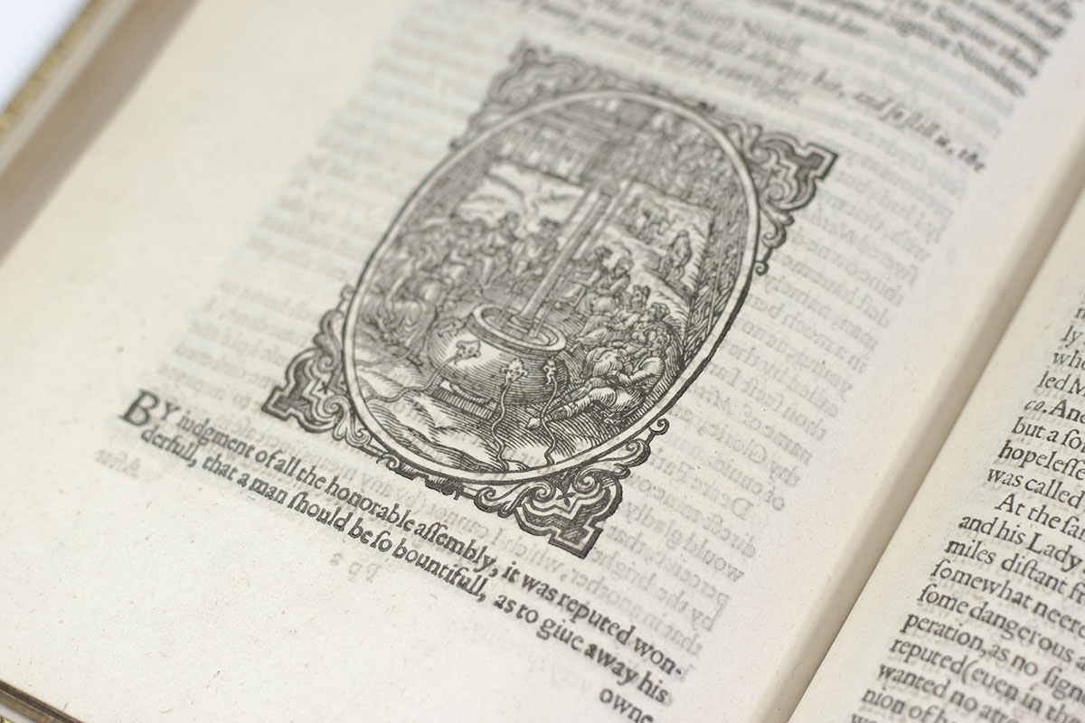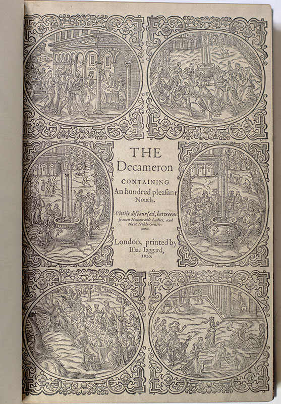 First edition in English of Boccaccio's masterpiece, published by Jaggard published three years prior to his printing of the Shakespeare First Folio. Boccaccio's masterpiece. Folio, 2 volumes, bound in full morocco by Riviere, gilt titles and tooling to the spine, all edges gilt, errata leaf at end of volume one, B1 is a cancellans, woodcut titles each with 6 vignettes, 98 woodcut vignettes in text chiefly repeating the title vignettes, woodcut initials, head- and tail-pieces. In near fine condition. First editions are rare.