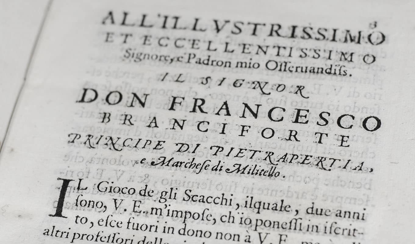 Rare first edition of one of the early chess manuals, and the first book printed in Militello at Prince Francesco Branciforte's private press. Octavo, bound in full contemporary vellum with ink titles to the spine, large engraving of the Branciforte coat of arms opposite the dedication page, woodcut illustrations throughout the text. In near fine condition. First editions are of exceptional rarity, with only three appearing at auction in the past 90 years.