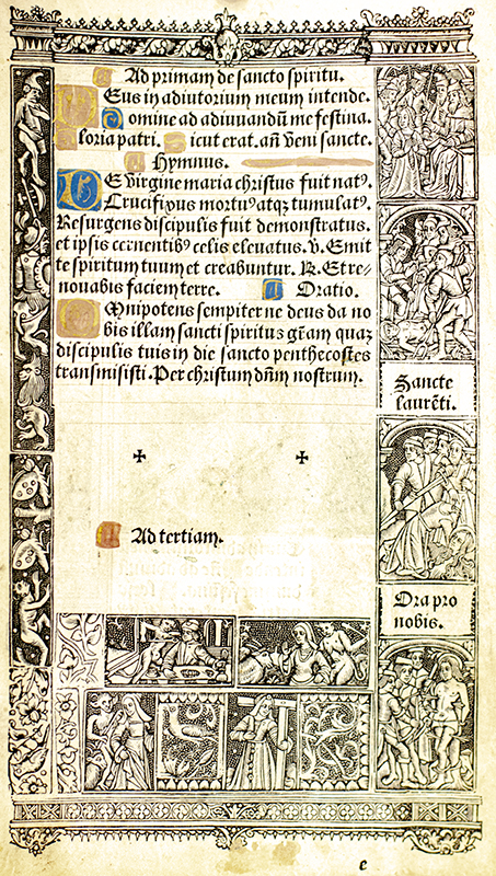A collection of prayers to be recited at canonical hours, the book of hours became popular in the Middle Ages, with illumination and decoration restricted to decorated capital letters at the start of prayers and psalms in most examples. Books created for wealthier patrons, however, were often decorated with lavish full-page miniature scenes depicting the eight Hours of the Virgin and the Labours of the Months and signs of the zodiac. The earliest example of full-page calendar miniatures in a book of hours were found in the Très Riches Heures of the Duke de Berry, the most famous and possibly the best surviving example of French Gothic manuscript illumination. The Dresden Prayerbook (actually a Book of Hours, now destroyed) had such a series, and its illuminator was especially favored for his calendar scenes, often contributing them to manuscripts painted by other artists.