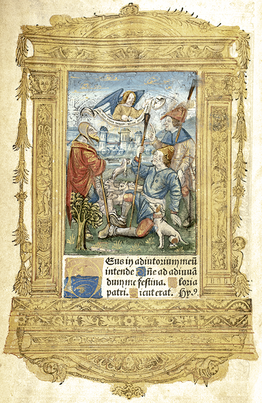 RARE ELABORATELY ILLUMINATED LEAF FROM A 16TH CENTURY BOOK OF HOURS DEPICTING THE ANNUNCIATION OF THE SHEPHERDS