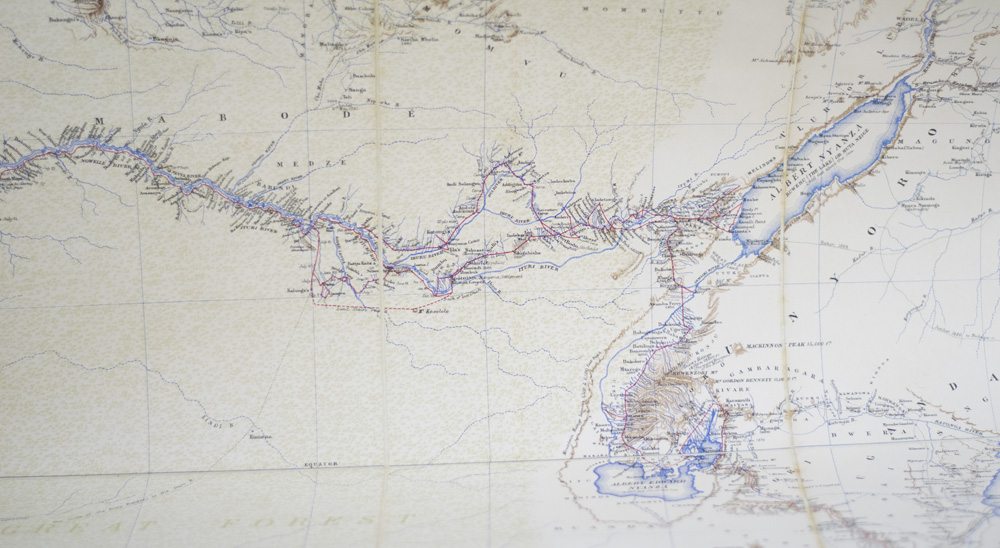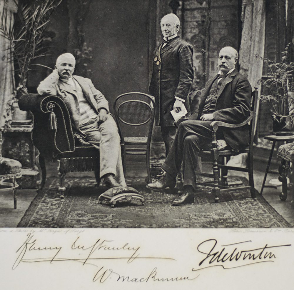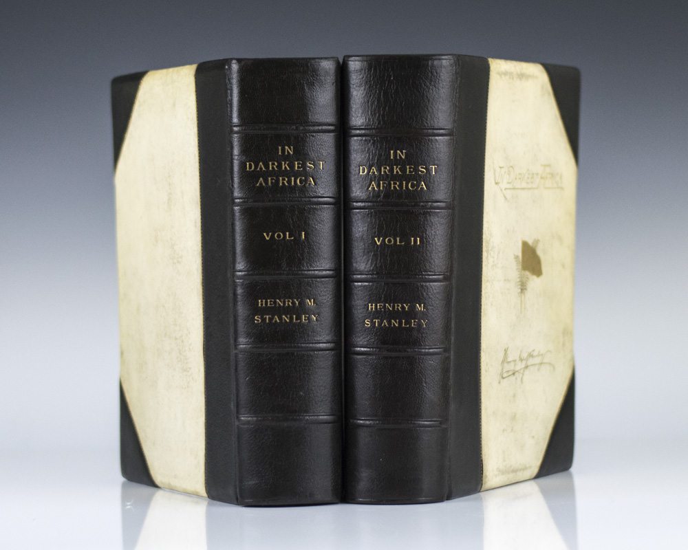First edition, edition de luxe, number 199 of 250 copies signed by Henry Stanley. Original half black morocco over vellum, top edges gilt, 2 volumes. Two steel-engraved portrait frontispieces, two photogravure plates on India paper, mounted, 36 wood-engraved plates on India, mounted, 6 etchings by M.G. Montbard signed by the artist in pencil, 4 coloured maps and plans; the 2 larger folding maps mounted on linen. In very good condition with some light rubbing to the extremities. From the library of Livingstone bibliographer Frank Bradlow, with his tasteful bookplate to the front panel. A nice example with noted provenance.