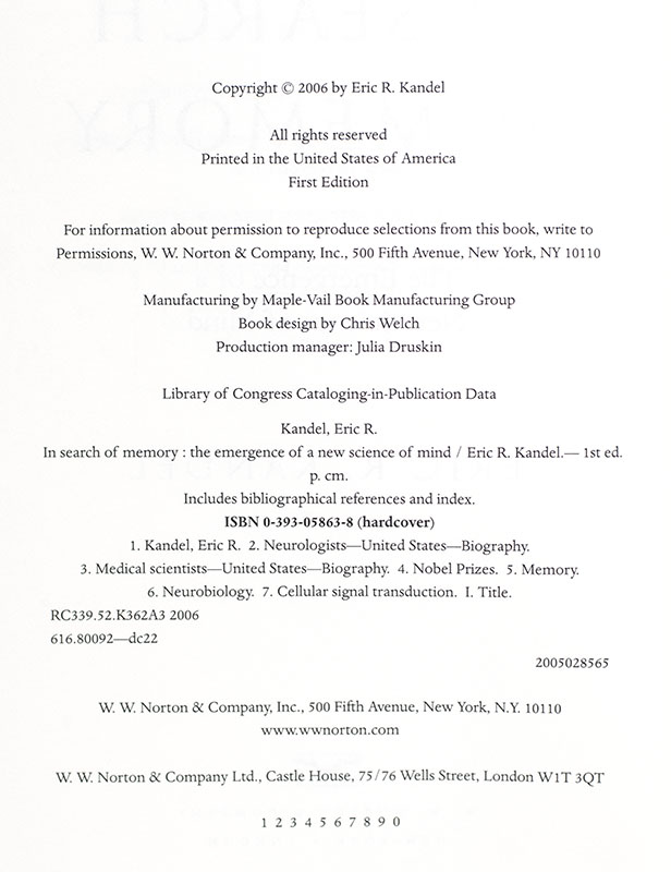 First edition of the scientist's autobiography which deals with the groundbreaking work on the biological process of memory, which earned him the Nobel Prize. Octavo, original half cloth. Presentation copy, inscribed by the author on the front free endpaper, "For Mayshan with best wishes Eric Kandel." Fine in a fine dust jacket.