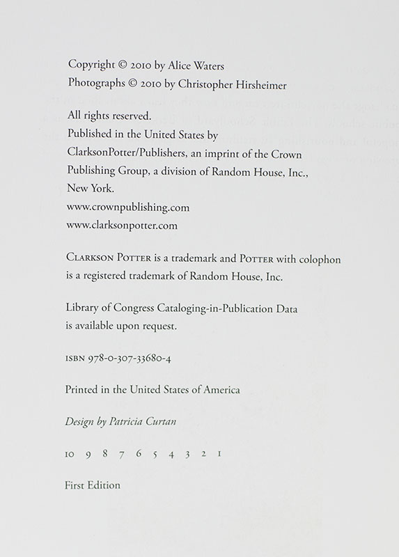 First edition of this indispensable cookbook. Quarto, original illustrated boards. Boldly signed by Alice Waters on the front free endpaper. In fine condition. Photographs by Hirsheimer and Hamilton.