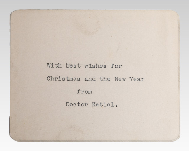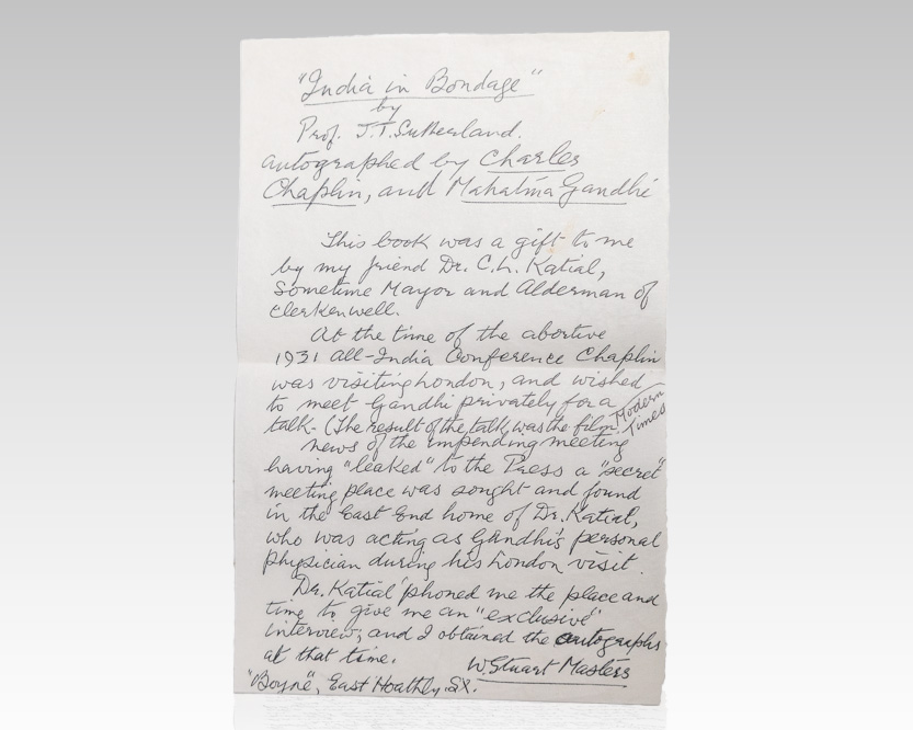 Accompanied by a typed holiday greeting card from Doctor Katial which reads in full, "With best wishes for Christmas and the New Year from Doctor Katial." Together with a handwritten letter of provenance from the original recipient, W. Stuart Masters. The letter reads in full, "'India in Bondage' by Prof. J.T. Sunderland. Autographed by Charles Chaplin and Mohandas Gandhi. This book was a gift to me by my friend Dr. C. L. Katial, sometime mayor and alderman of Clerkenwell. At the time of the abortive 1931 All-India Conference Chaplin was visiting London, and wished to meet Gandhi privately for a talk. (The result of the talk was the film Modern Times). News of the impending meeting have 'leaked' to the Press a 'secret' meeting place was sought and found in the East End home of Dr. Katial, who was acting as Gandhi's personal physician during his London visit. Dr. Katial phoned me the place and time to give an 'exclusive' interview; and I obtained the autographs at that time. W. Stuart Masters." Both are in near fine condition and laid in.