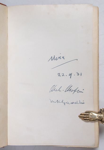 First edition of this political critique of British colonial rule in India. Octavo, original publisher's cloth with gilt titles to the spine, vignette of India stamped in gilt to the front panel, frontispiece of Nobel Prize-winning Indian author Rabindranath Tagore, illustrated with black and white photographs throughout. Boldly signed by Mohandas Gandhi and comic actor, filmmaker, and composer Charlie Chaplin on the recto of the frontispiece in fountain pen. Additionally signed and dated by Mirabehn on the recto of the frontispiece, "Mira 22.9.31." Mirabehn was the name adopted by Madeleine Slade (1892-1982), an Englishwoman who became a devoted follower of Mahatma Gandhi and an influential figure in India's independence movement. In very good condition.