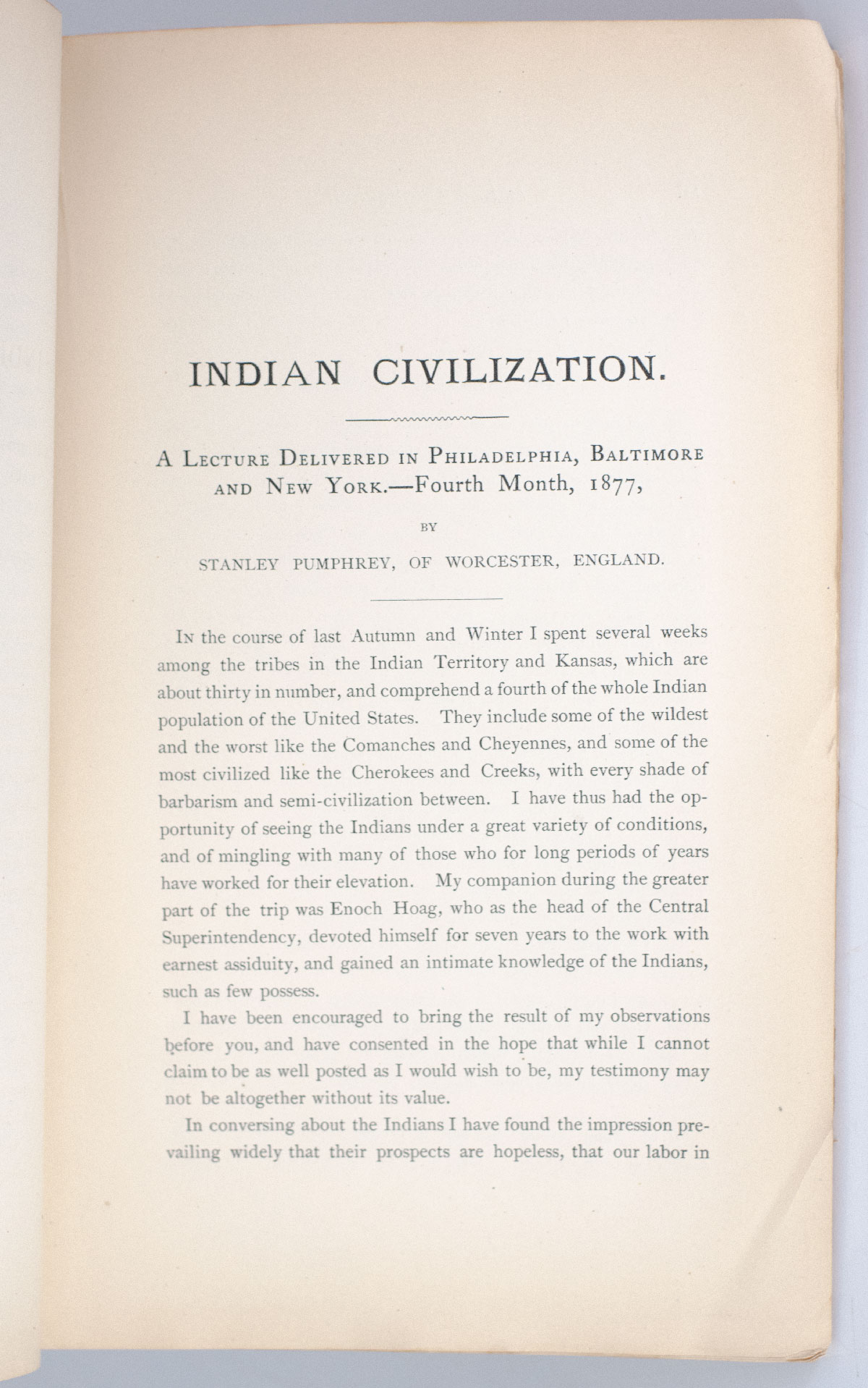 Rare first edition of Stanley Pumphrey's Indian Civilization: A Lecture by Stanley Pumphrey of England; with the rare folding hand-colored map of the Indian Territory
