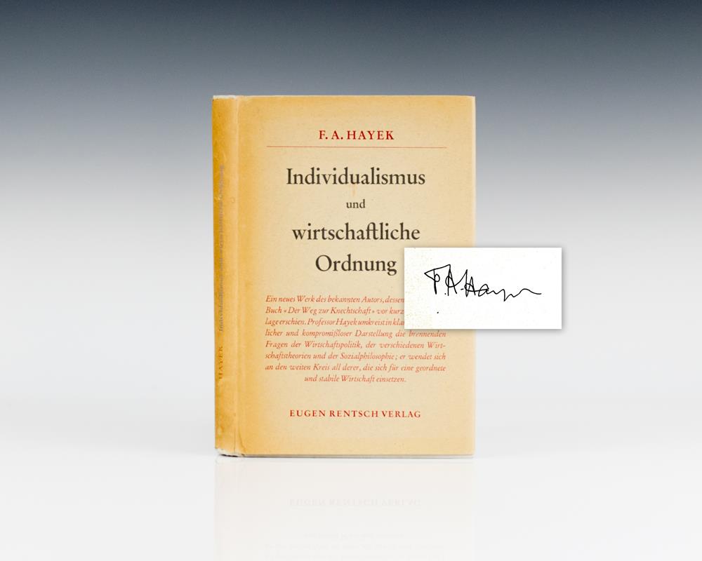 First German edition of this collection of economic essays rejecting socialism in favor of true individualism. Octavo, original cloth. Boldly signed by F.A. Hayek on the front free endpaper. Near fine in a near fine dust jacket with light rubbing. Scarce and desirable signed.
