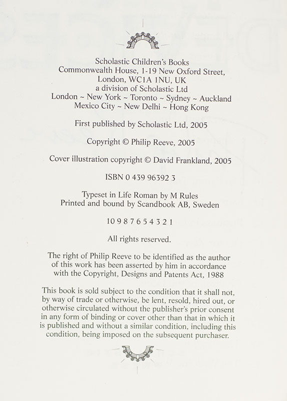 First edition of the third novel in Reeve's award-winning Mortal Engines quartet. Octavo, original cloth, pictorial endpapers. Signed by Philip Reeve on the title page. Near fine in a near fine dust jacket. Jacket illustration by David Frankland.