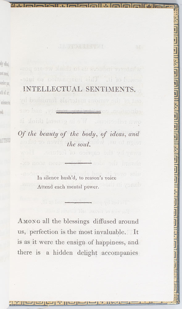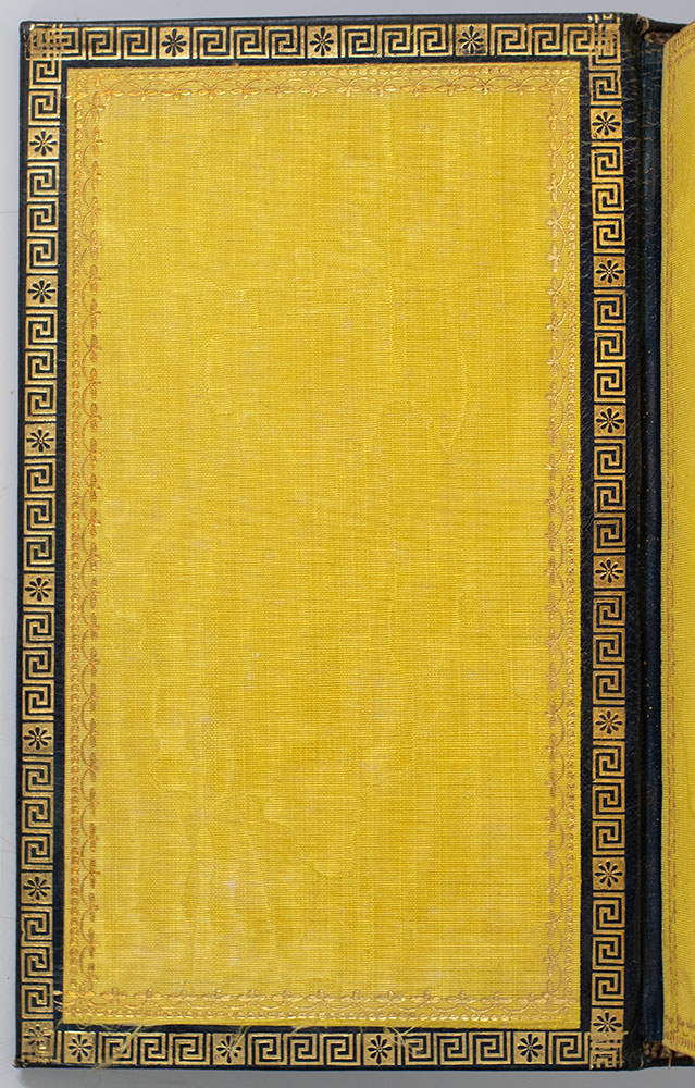 Rare Royal binding of this very uncommon title. Octavo, bound in full contemporary straight grain morocco by Charles Meyer of London for the Royal Family, gilt titles and Greek key ruling to they spine, elaborate gilt ruling and botanical scrolling to the front and rear panels, gilt central initial 'A' beneath a royal crown to the front panel (likely for Princess Amelia, the youngest daughter of George III), gilt turn-ins and inner dentelles, yellow watered silk endleaves and doublures decorated in gilt, all edges gilt, ribbon bound in. Charles Meyer was the bookbinder to George III and his family. With Meyer's bookseller's and binder's ticket which reads, "C. Meyer, Bookseller & Binder to the Queen and Princesses." In near fine condition. Housed in a custom clamshell box. Rare.