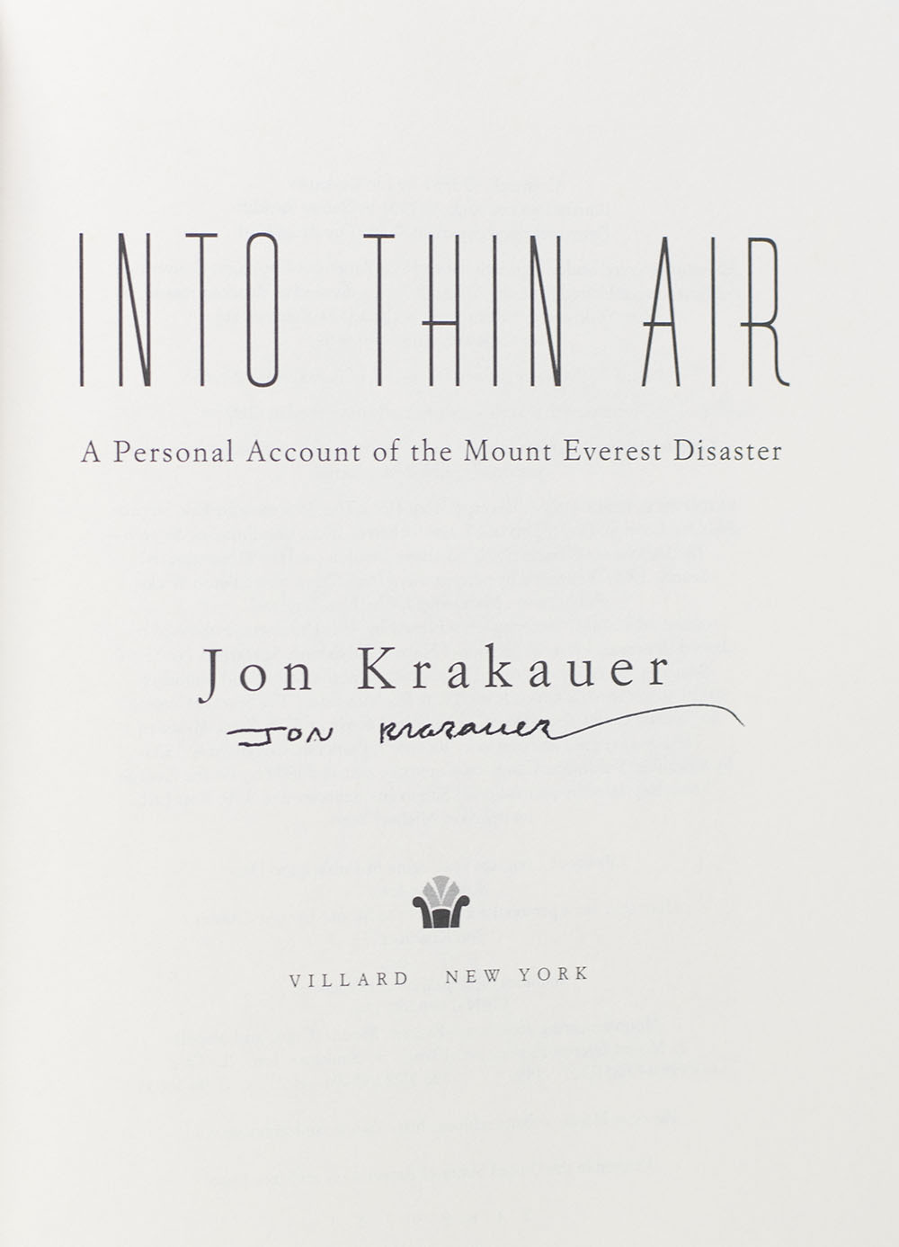 "Achieving the summit of a mountain was tangible, immutable, concrete": First Edition of Into Thin Air; Signed by Jon Krakauer