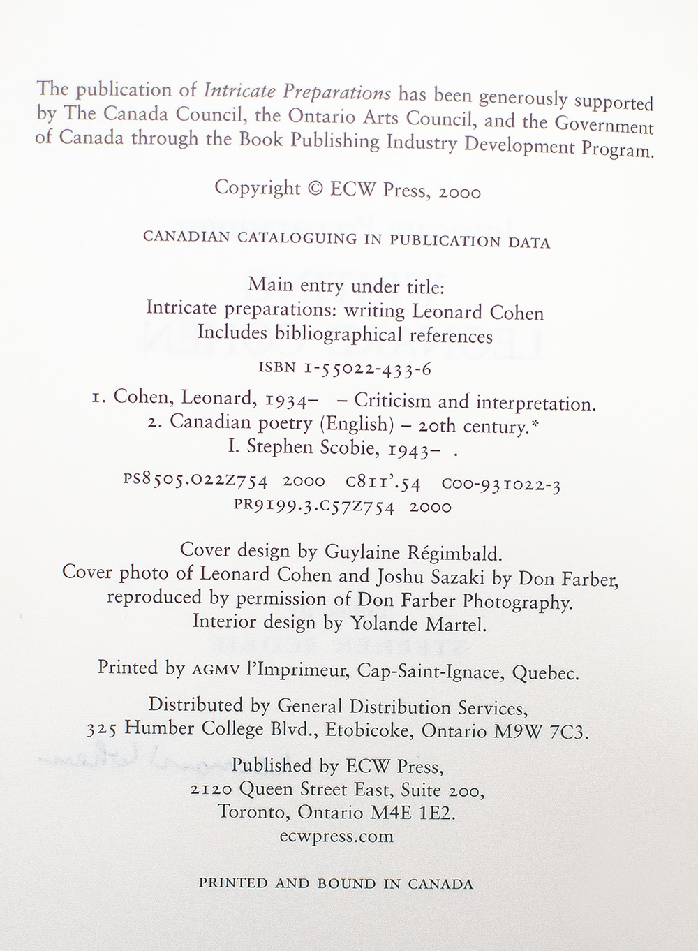 First Edition of Intricate Preparations: Writing Leonard Cohen; Signed by Leonard Cohen