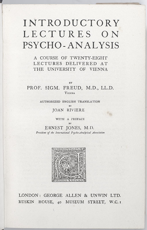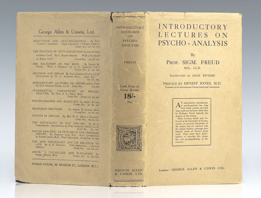 First British edition and first edition in the English language of this fundamental work on psychoanalysis. Octavo, original cloth with gilt titles and ruling to the spine, engraved frontispiece and printer's device to the title page. Translated by Joan Riviere with a preface by Ernest Jones. Very good in the otherwise non-extant original dust jacket. Contemporary inscription to the front free endpaper. The only traceable example of this important work in the original dust jacket.