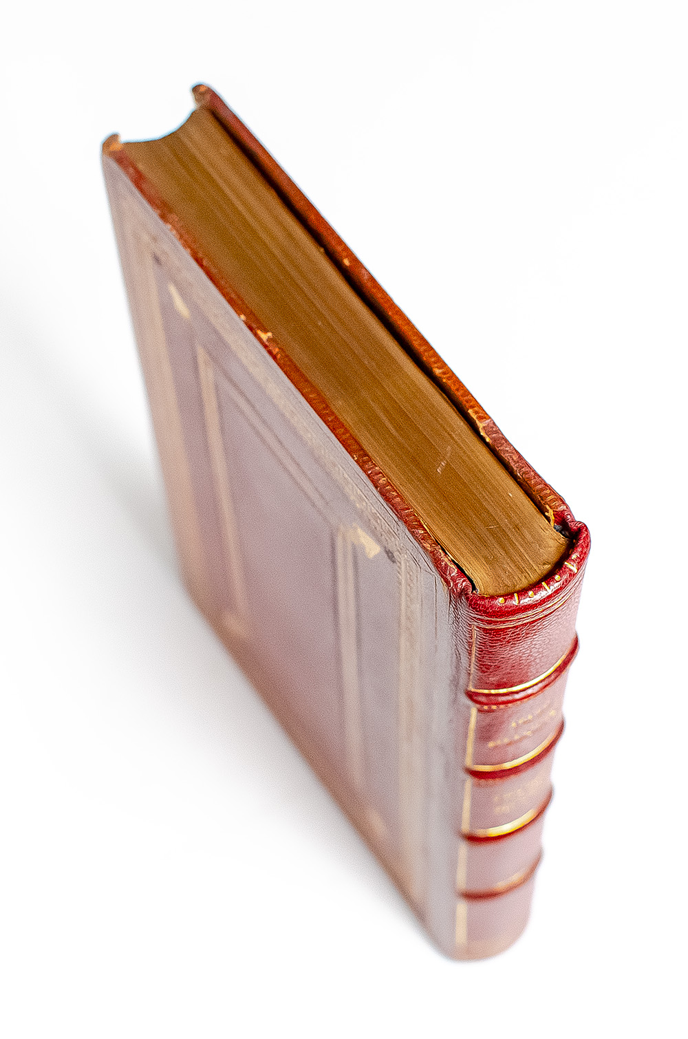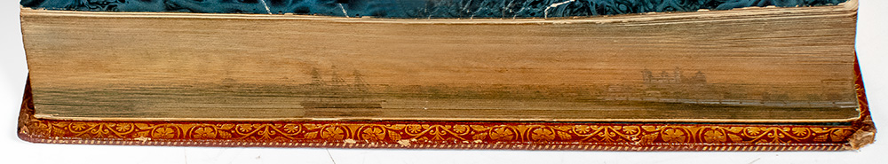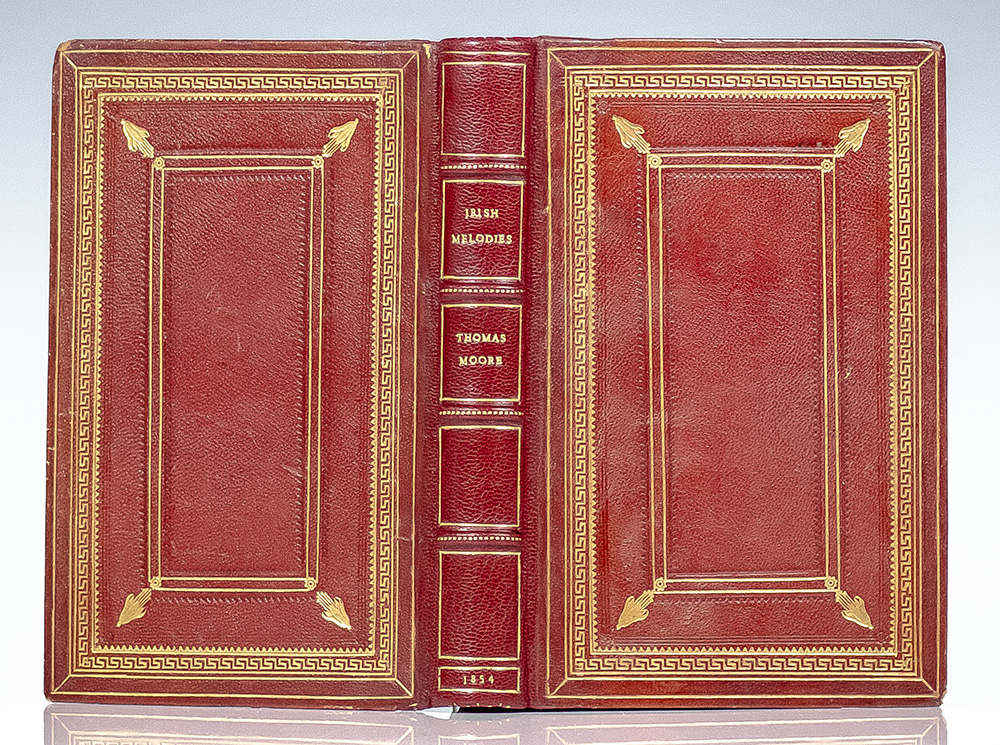 Finely bound selection of lyrics set to Irish tunes. Duodecimo, bound in full morocco with gilt titles to the spine in five compartments within raised gilt bands, gilt turn-ins and inner dentelles, marbled endpapers, all edges gilt, decorated with a concealed double fore-edge painting. In very good condition with light rubbing to the extremities, slight lean to the spine, light toning to the endpapers and margins, gift inscription to the front flyleaf, and a closed tear to the rear endpaper. Rare with an attractive double fore-edge painting. The term 'fore-edge painting' can refer to any painted decoration on the fore-edges of the leaves of a book, such as was not uncommon in the 15th and early 16th centuries, particularly in Italy. The term is most commonly used, however, for an English technique quite widely practiced in the second half of the 17th century in London and Edinburgh, and popularized in the 18th century by John Brindley and, in particular, Edwards of Halifax, whereby the fore-edge of the book, very slightly fanned out and then held fast, is decorated with painted views, or conversation pieces. The edges are then squared up and gilded in the ordinary way, so that the painting remains concealed while the book is closed: fan out the edges and it reappears. The technique was practiced by a few other English binders in the late 18th and 19th centuries, and a certain number of undoubted examples survive.