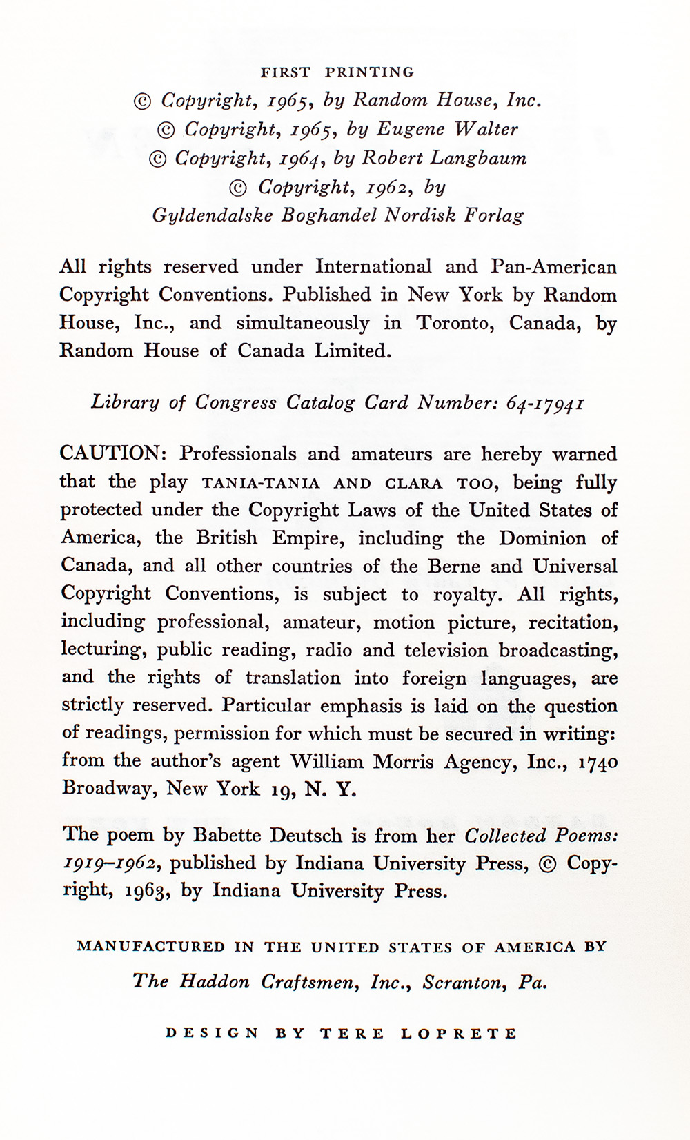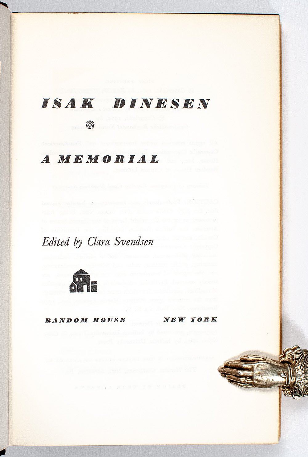 First edition of this tribute to the life of the brilliant Danish writer Karen Blixen, a collection of essays from her friends compiled by her secretary and companion Clara Svendsen. Octavo, original black cloth, green endpapers. Near fine in a very good dust jacket. Bookplate to the front free endpaper of "Glenway Wescott" with a notation of the page his entry appears. Wescott was an expatriate American poet, novelist, and essayist who met Blixen in 1959 on her way to the National Institute of Arts and Letters. In his entry, he writes, "Though I was not one of Isak Dinesen's old or close or important friends ... at the news of her death I wept miserably."