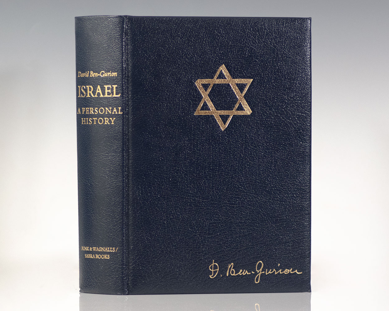 Signed limited edition of Ben Gurion's history of Israel, number 1847 of 2000 copies. Signed beneath the photographic frontispiece by David Ben-Gurion. Thick quarto, original full dark blue morocco, watered silk endpapers, top edge gilt, illustrated. Fine in a fine slipcase.
