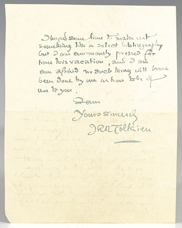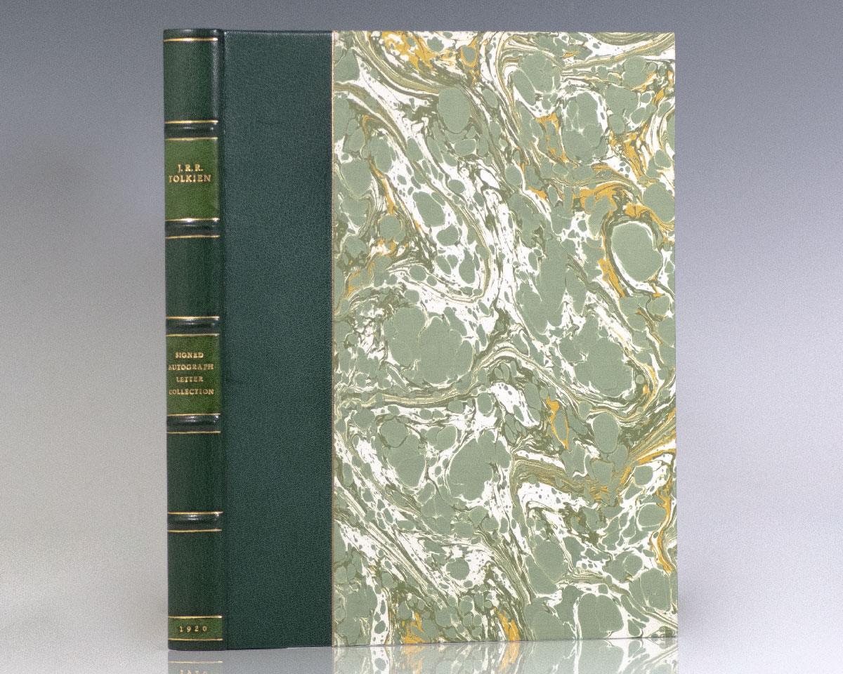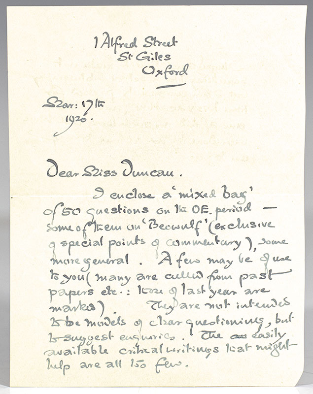 Rare autograph letter signed by the author of The Lord of the Rings Trilogy, J.R.R. Tolkien regarding a list of 50 questions he has composed examining Old English Literature. The one-page autograph letter signed by Tolkien reads in full, "1 Alfred Street St. Giles Oxford Mar: 17th 1920. Dear Miss Duncan, I enclose a 'mixed bag' of 50 questions on the OE period - some of them on 'Beowulf' (exclusive of special points of commentary), some more general. A few may be of use to you (many are culled from past papers etc.: those of last year are marked). They are not intended to by models of clear questioning , but to suggest enquiries. The easily available critical writings that might help are all 150 few. I hoped some time to make out something like a select bibliography but I am enormously pressed for time this vacation, and I am ever afraid no such thing will have been done by me in time to be of use to you. I am yours sincerely JRR Tolkien." The three-page typed list of 50 questions with autograph emendations by Tolkien is entitled "Old English Literature Questions." Tolkien has inserted a comedic addition "lumbering about in potbellied equanimity" to the question: "A gluttonous race of Jutes and Angles, capable of no grand combinations not dreaming of heroic toll, and silence, and endurance, such as lead to the high places of this universe, and the golden mountain tone where dwell the spirits of the dawn' (Carlyle). How far would your reading of Old English poetry land you to modify this estimate?" Tolkien has also added a 51st question in his hand at the conclusion of the questionnaire, "Give an account of one important ins. of English poetry. Indicate its value for our knowledge of the subject as a whole." In fine condition. Housed in a custom half morocco clamshell box made by the Harcourt Bindery. An extraordinary pairing, offering a unique glimpse into Tolkien's broad literary knowledge and influences.
