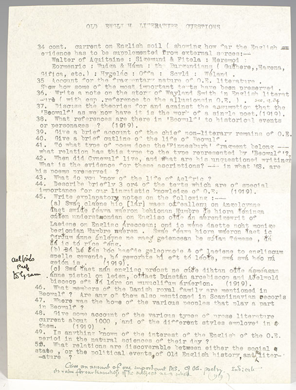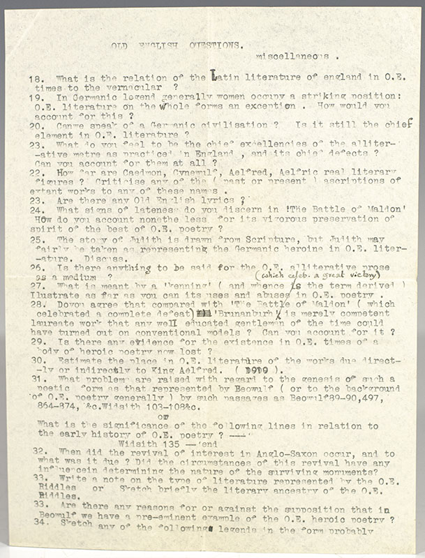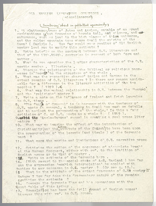 "I am enormously pressed for time this vacation, and I am ever afraid no such thing will have been done by me in time to be of use to you": Rare autograph letter signed by J.R.R. Tolkien with his list of Old English Literature Questions with annotations and corrections in his hand